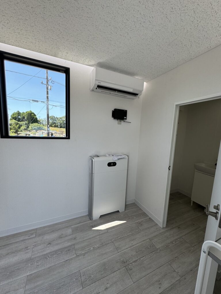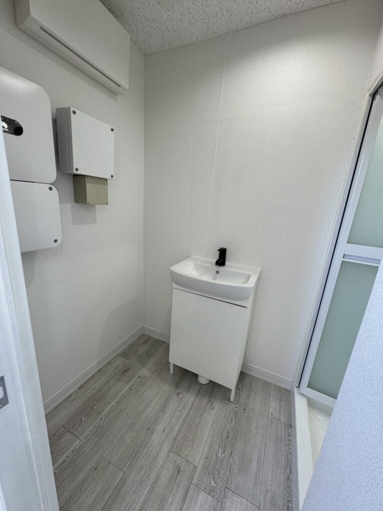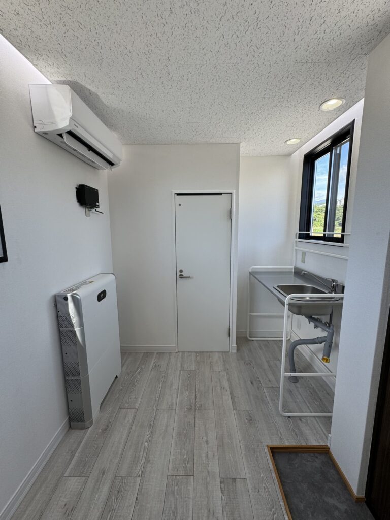 手洗いシンク、ミニキッチンシンク、シャワーブース、2.2kWhエアコン、ロスナイ換気システム、ファーウェイ全負荷ハイブリッド蓄電システム10kWh、太陽光発電パネル580W×4枚、給水タンク、系統電力繋ぎ込みポート