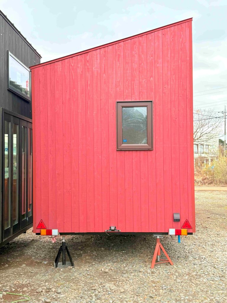 ベンガラ色の外観と北欧モダンな内装。水回り・ミニキッチンを完備したトレーラーハウス