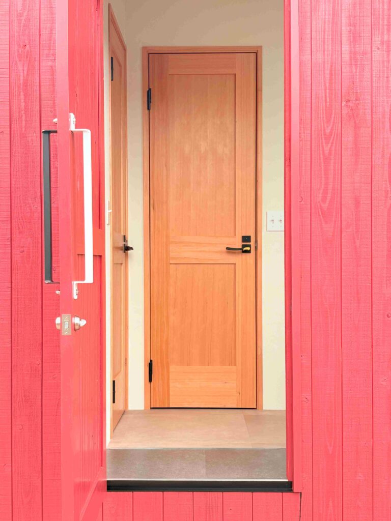 外観は落ち着いたベンガラ色で、他にないおしゃれなデザインが魅力。内装は北欧モダンな白を基調とし、明るく爽やかな雰囲気を演出。大きなFIX窓が切り取る屋外の景色を楽しみながら、心地よい時間を過ごせます。