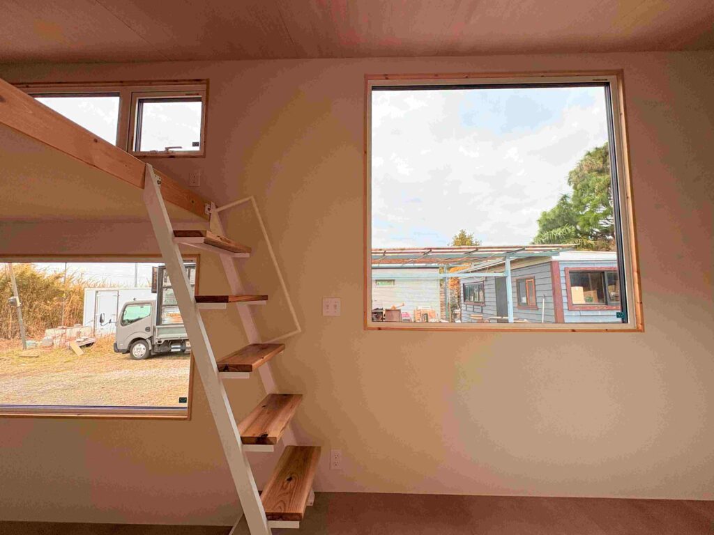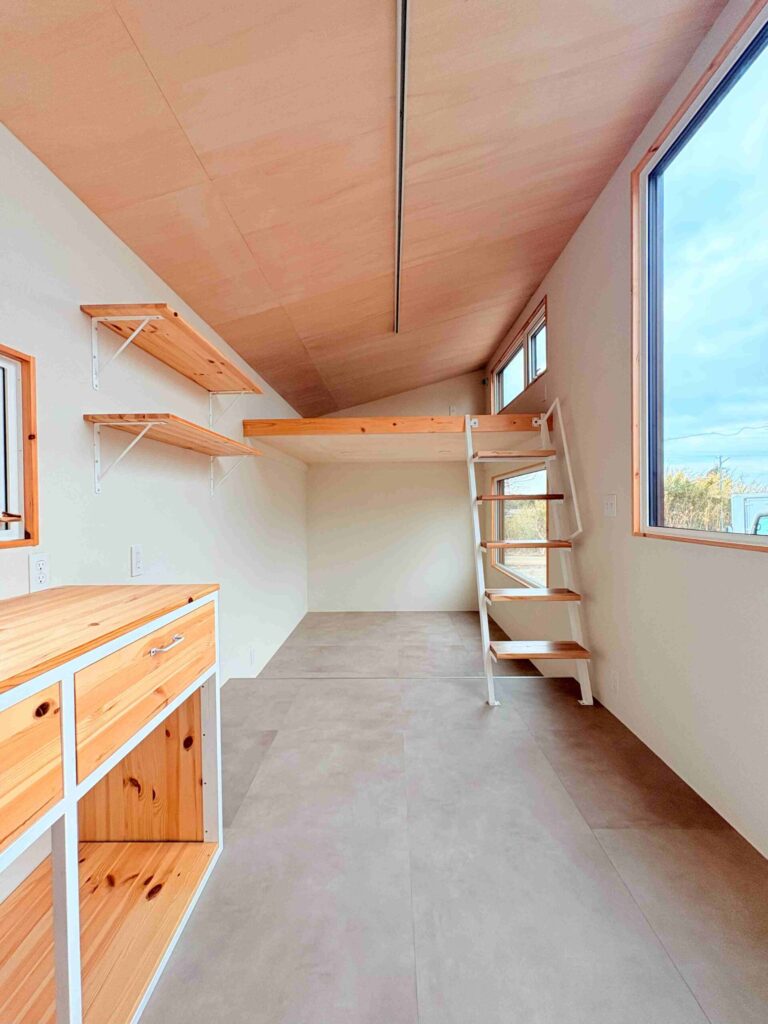 内部にはキッチン・トイレ兼パウダールーム・シャワーなどの水回りを完備し、キッチンの奥にはベッドルーム、ストレージとしても寝室としても使えるロフトを配置しています。