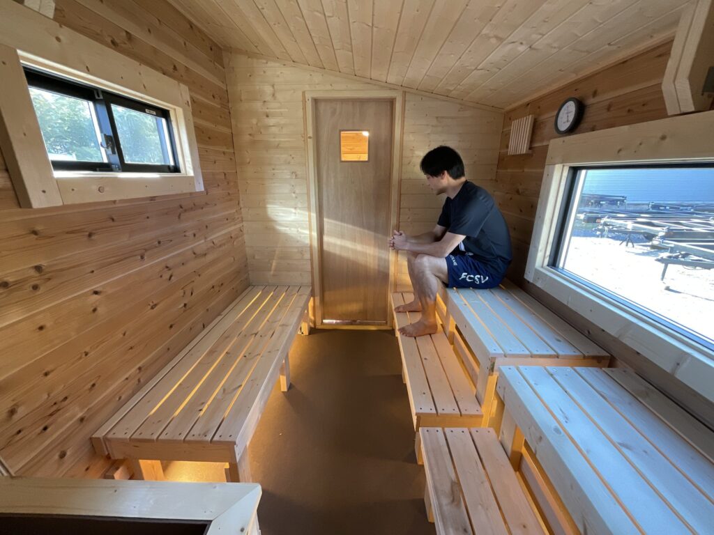 大人4名がゆったりとくつろげる広さのサウナ室を備え、友人同士や家族でも快適に利用可能。脱衣スペースも十分な広さがあり、着替えや休憩もスムーズに行えます。
