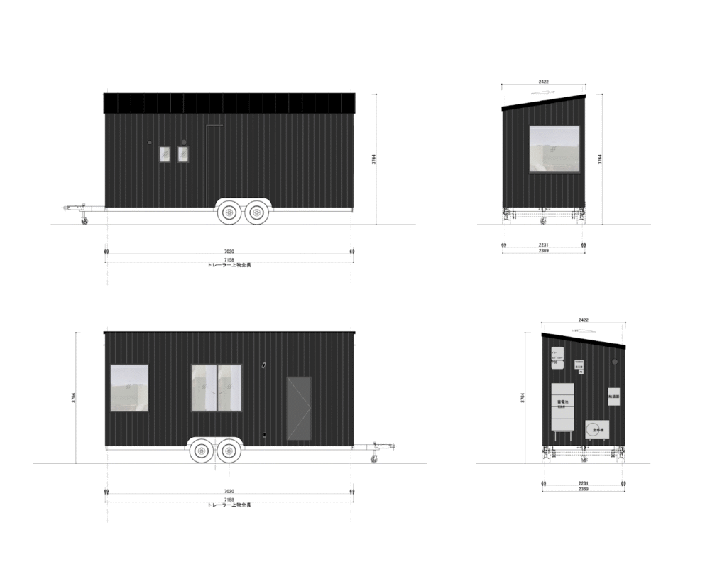 ベンチ、カウンター、ステンレスキッチン、タンク式トイレ、シャワーブース、洗面台、換気扇、棚、ダウンライト、ライティングレール、太陽光システム(Roof–1、パワー・コンディショナー、分電盤(切替機能付き)、電力測定器、蓄電池)