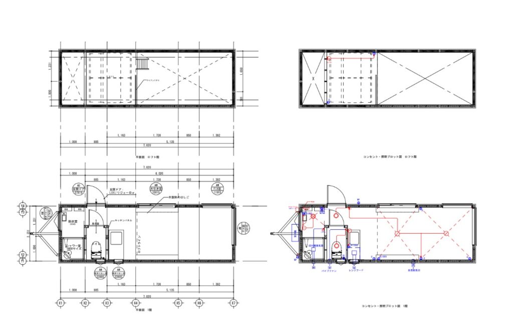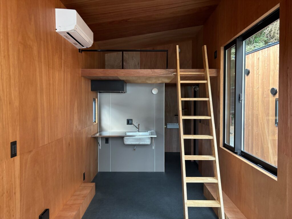 水回りの上部にはロフトを配置し、限られた面積を効率的に活用。キッチン、トイレ、ユニットシャワー、洗面台がコンパクトながら実用的にレイアウトされており、複数人でも快適にお過ごしいただけます。