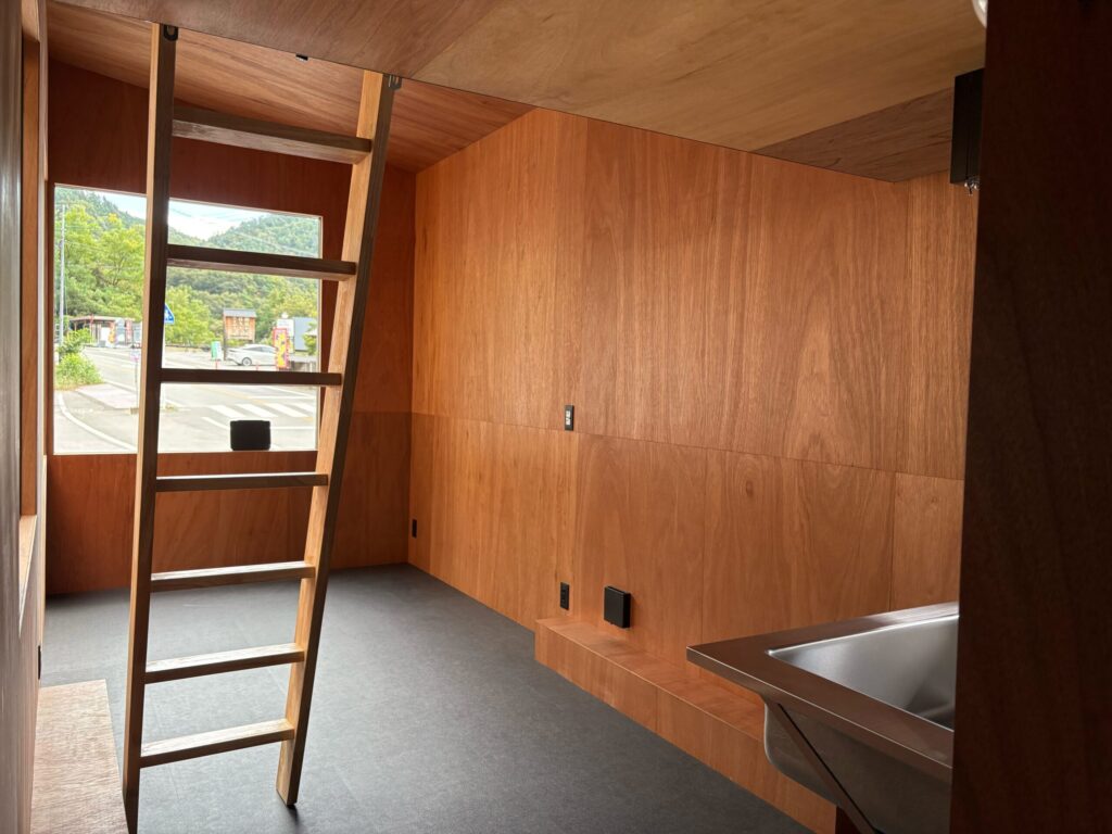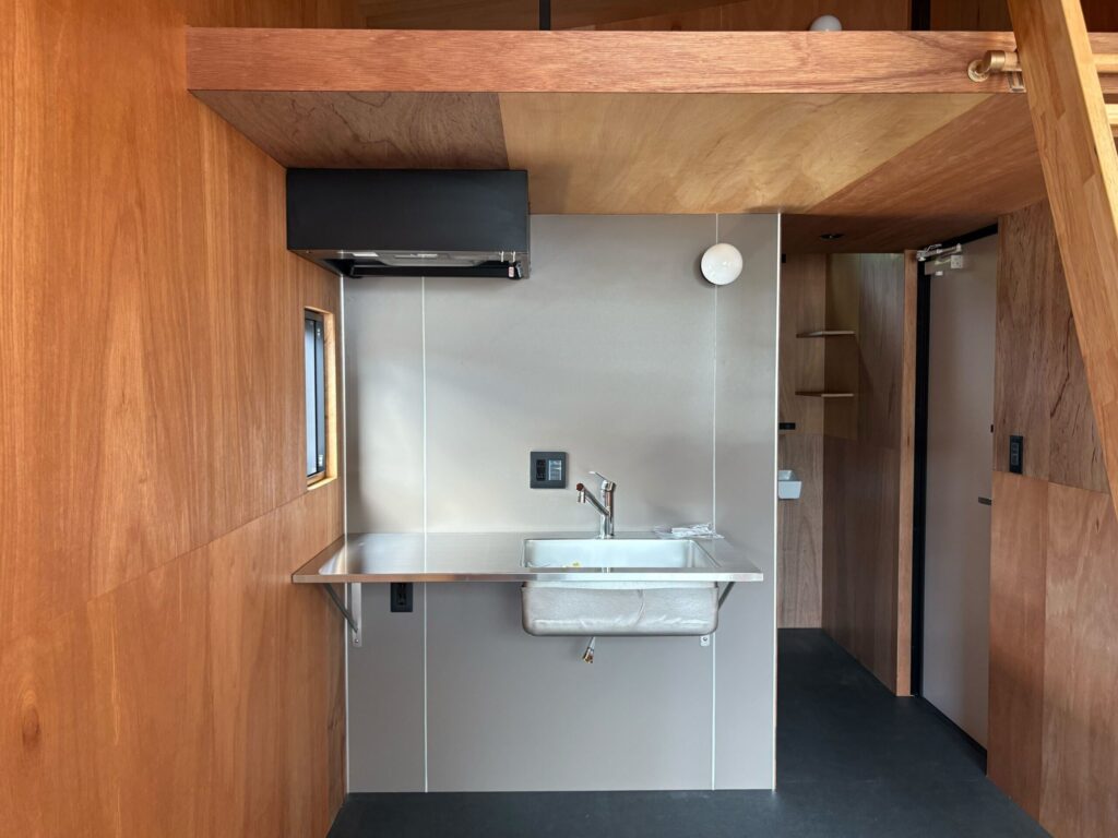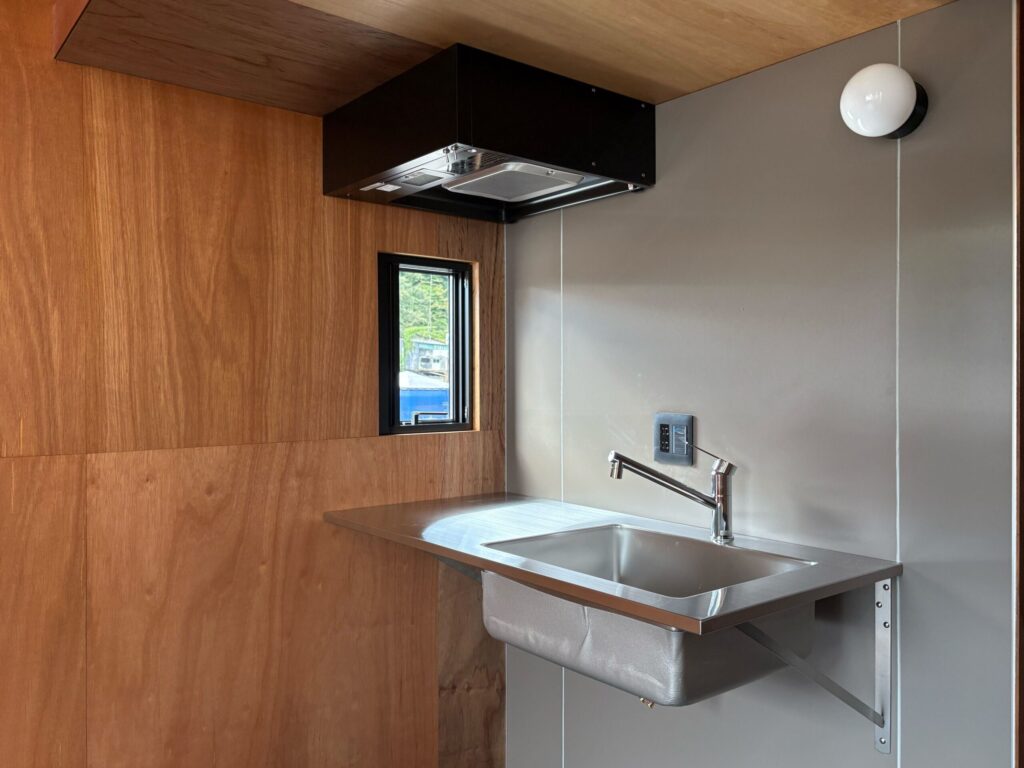 調理スペースには簡易キッチンを設置。IHコンロやカセットコンロを追加すれば、簡単な調理も可能です。