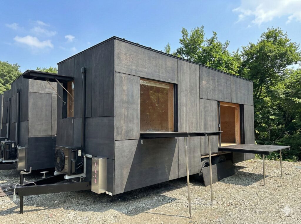 木目と黒を基調としたシックな宿泊トレーラー