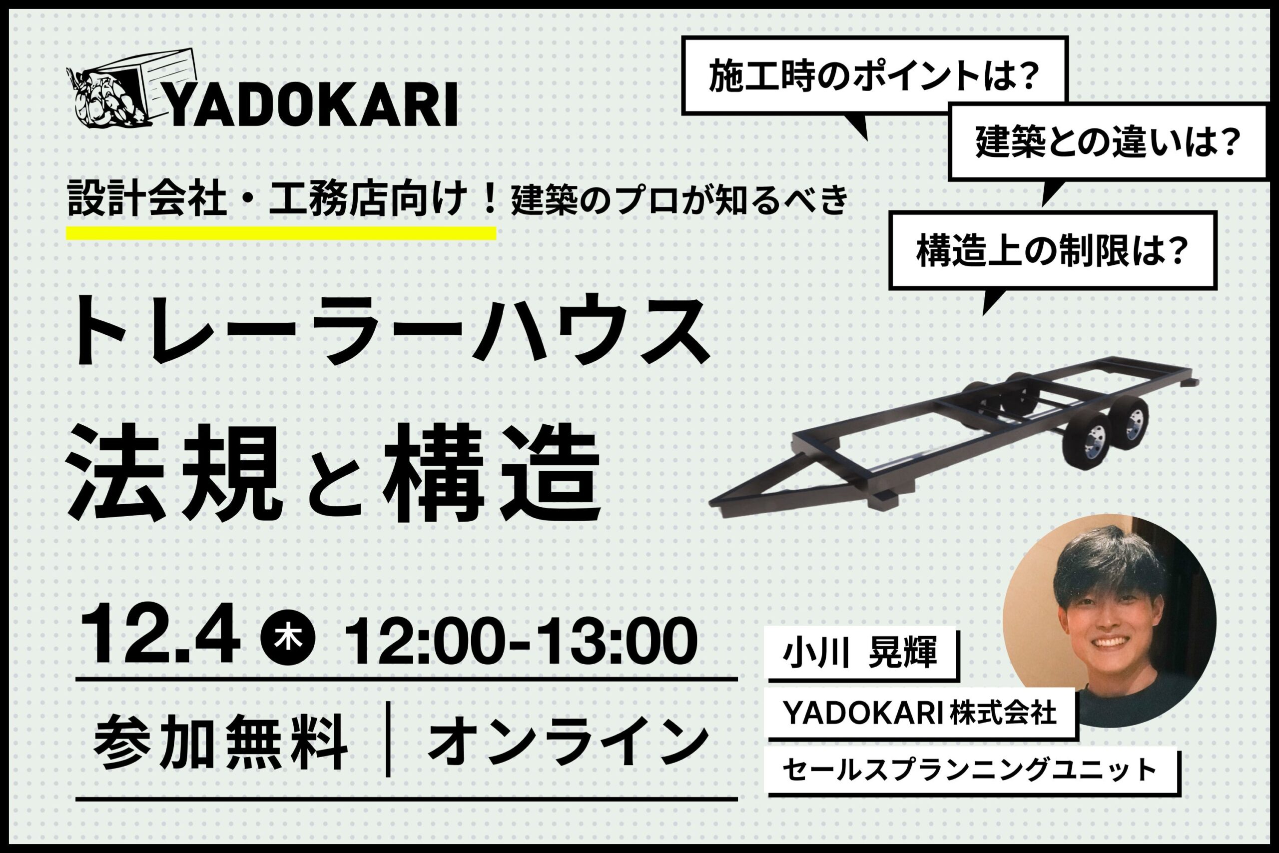動かせる不動産「可動産」を通じて、新しい事業の形を提案するYADOKARIが、設計会社・工務店向けオンラインセミナー「建築のプロが知るべきトレーラーハウスの法規と構造~シャーシの選定と設計ノウハウを徹底解説~」を開催いたします!