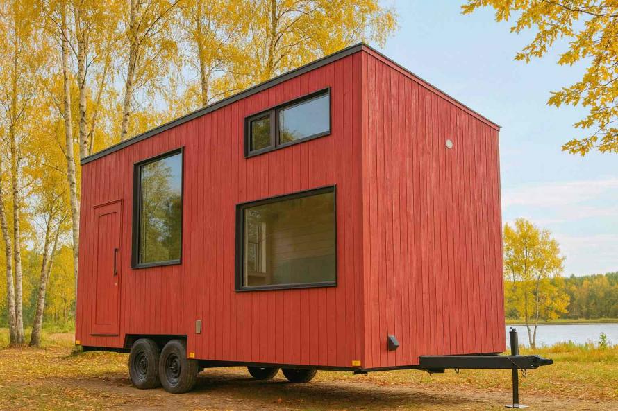 ベンガラ色の外観と北欧モダンな内装。水回り・ミニキッチンを完備したトレーラーハウス。