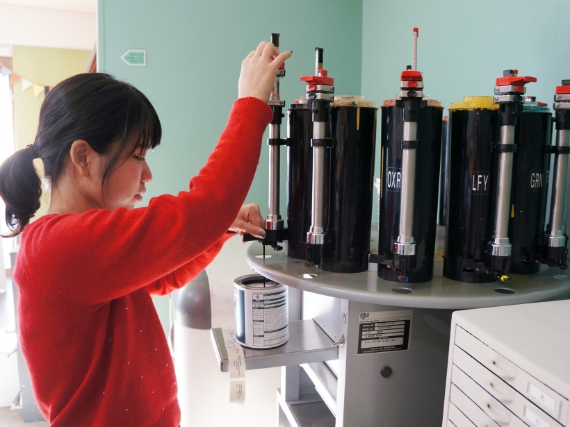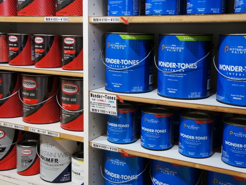 - 色は約6000色から、つやはつや消し・2分つや・5分つやから選ぶことができます。今までの塗料にはない鮮やかな色や、微妙なトーンを再現することが可能です。色の見本となるものがあれば専用の機械で色を測り、近似色のペンキをお作りすることも可能です。また、塗料をご注文いただくと、店頭で顔料を混ぜてお作りし、最短で1缶10分でお渡しできます。