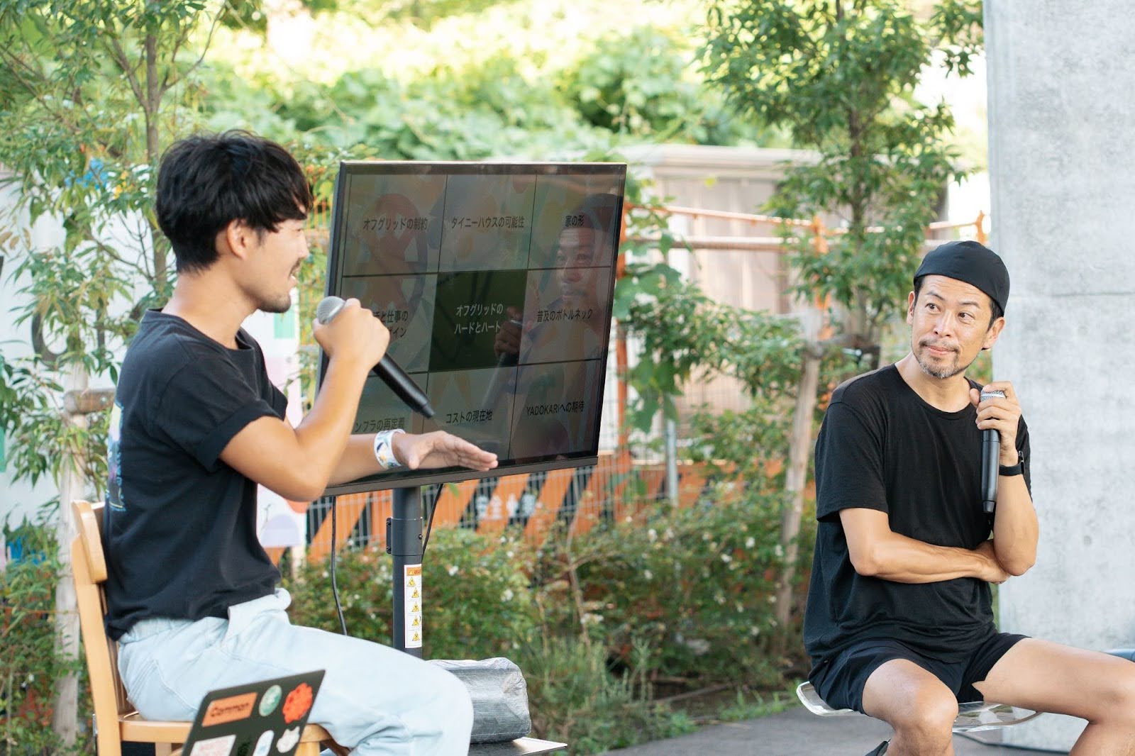 その後は、自然と調和した暮らしを探求するarbol一級建築士事務所の堤 庸策さんを迎えたトークセッションがスタート。実際にオフグリッドの住まいで生活しながら実践と探求を続ける堤さんと共に、「オフグリッドと共にある暮らし」について紐解いていきます。