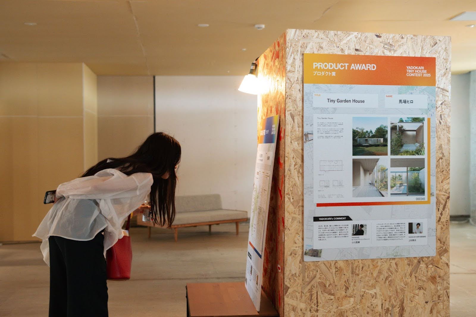 お向かいのお部屋では、初の自社開催となった「YADOKARI TINY HOUSE CONTEST 2025」で集まった157作品が展示されました。ひとつのタイニーハウスにこだわりを詰め込んだアイデアから、タイニーハウスを複数使ってコミュニティづくりを提案する作品まで、多様な視点が並び、とても見ごたえがありました。