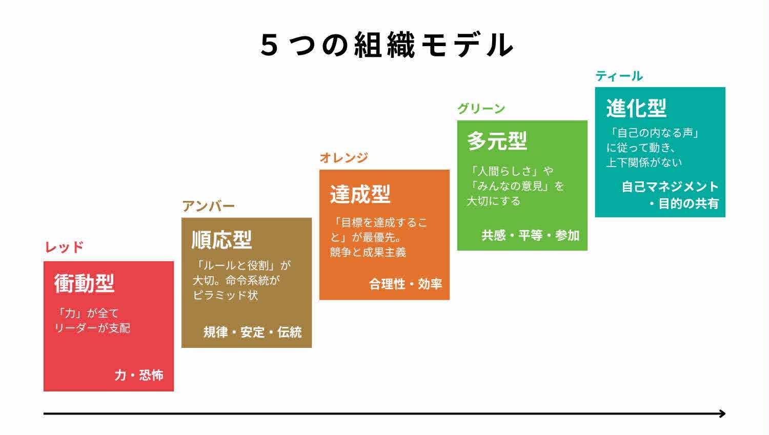 *③:フレデリック・ラルーは著書『ティール組織』で「5つの組織モデル」として、組織の進化の段階を色と共に表している。