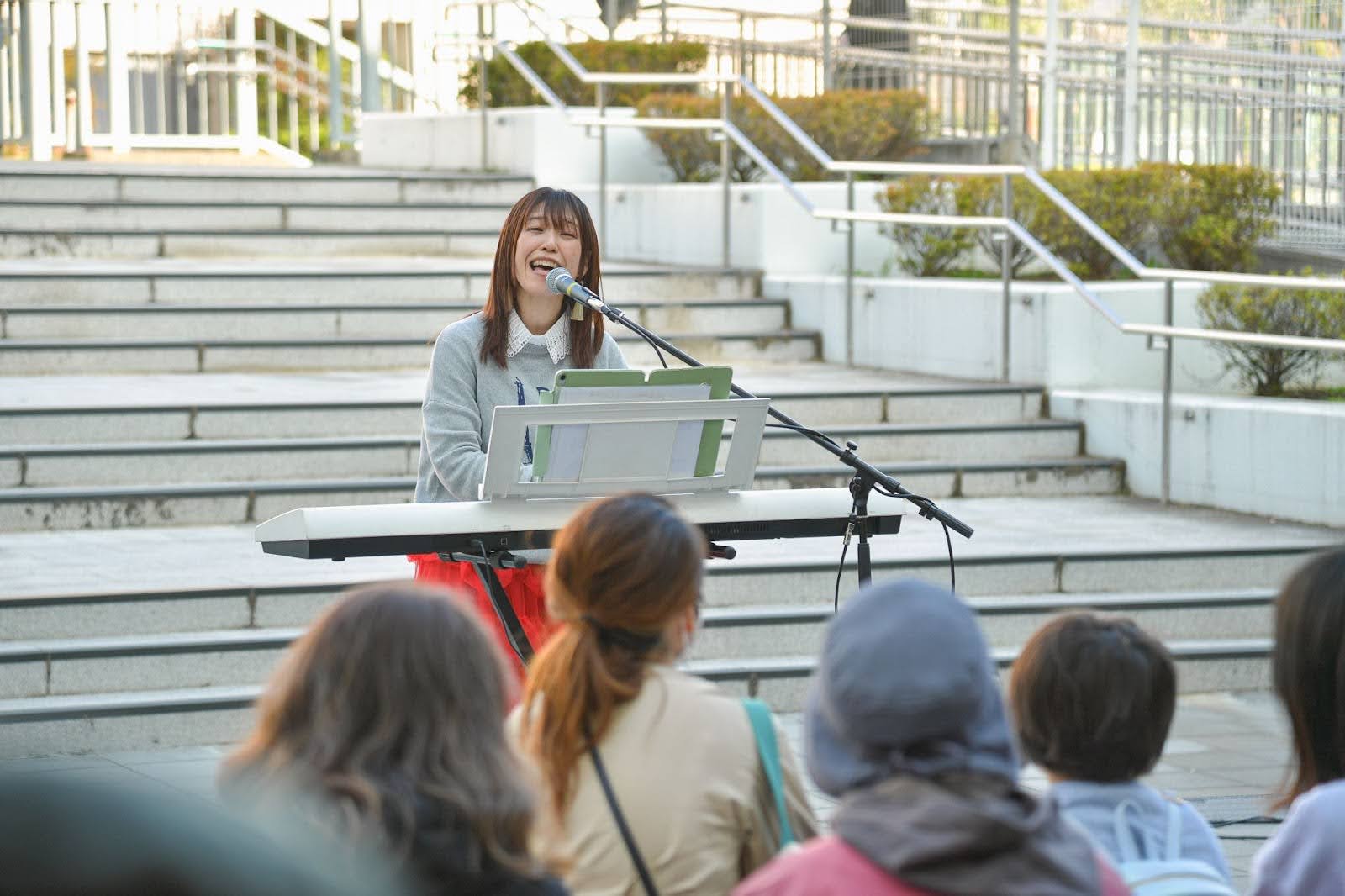 横浜・湘南を中心に活動するシンガーソングライター エソラビト さんは、キーボードの弾き語りで、やさしい空気を会場に運びます。「さんぽ」の演奏では、小さな子どもたちが体を揺らしながら楽しむ姿も。キッチンカーで買ったごはんを片手に、それぞれが思い思いの場所で腰を下ろし、流れてくる音楽に耳を傾ける。そんな、時間がゆったりと流れるような光景が随所に見られました。