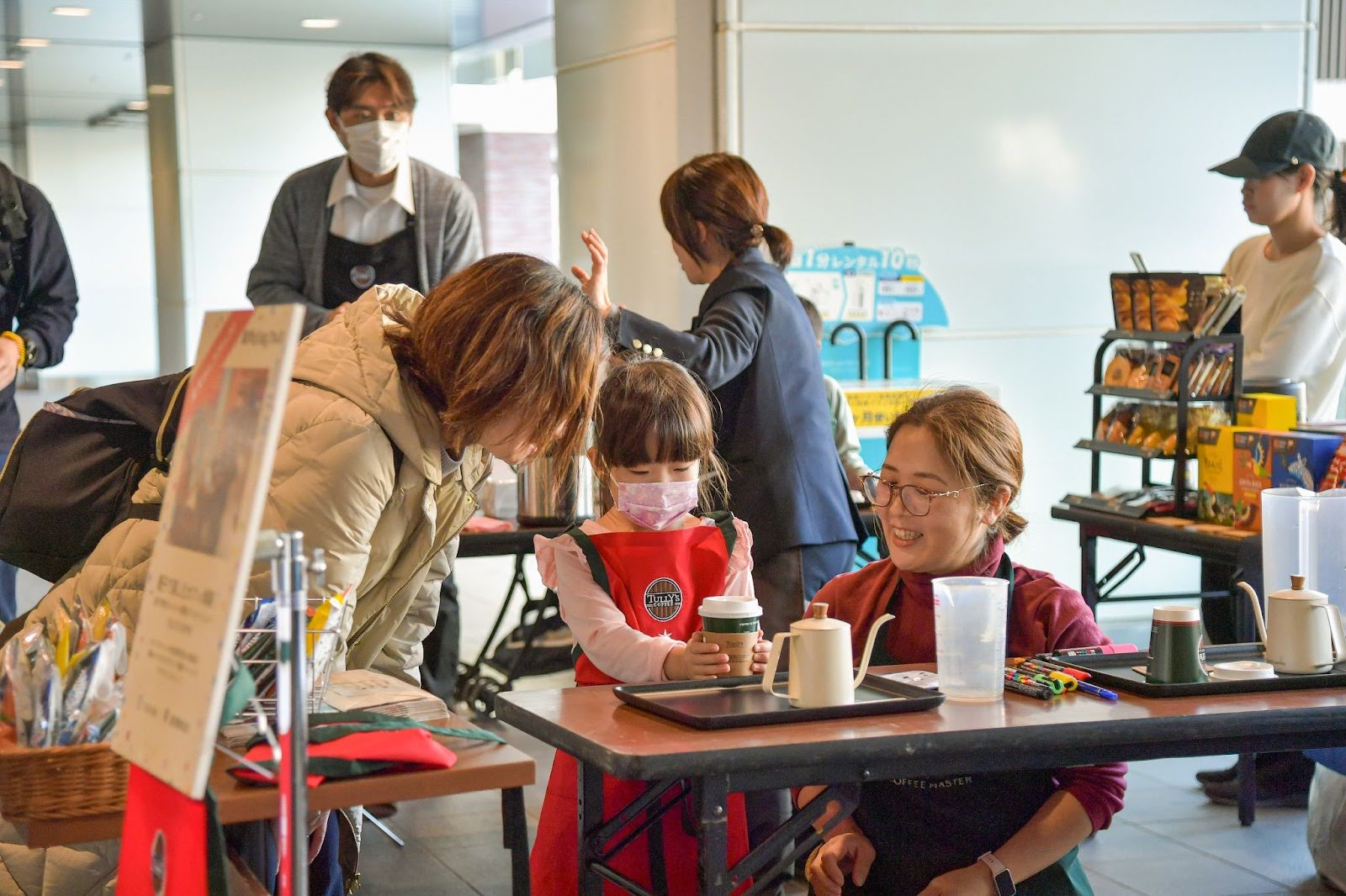 星川駅前特設ブースでは、子どもたちがバリスタになりきってコーヒーの抽出に挑戦。エプロン姿で真剣にコーヒーを淹れる姿を、保護者の方が温かく見守ります。