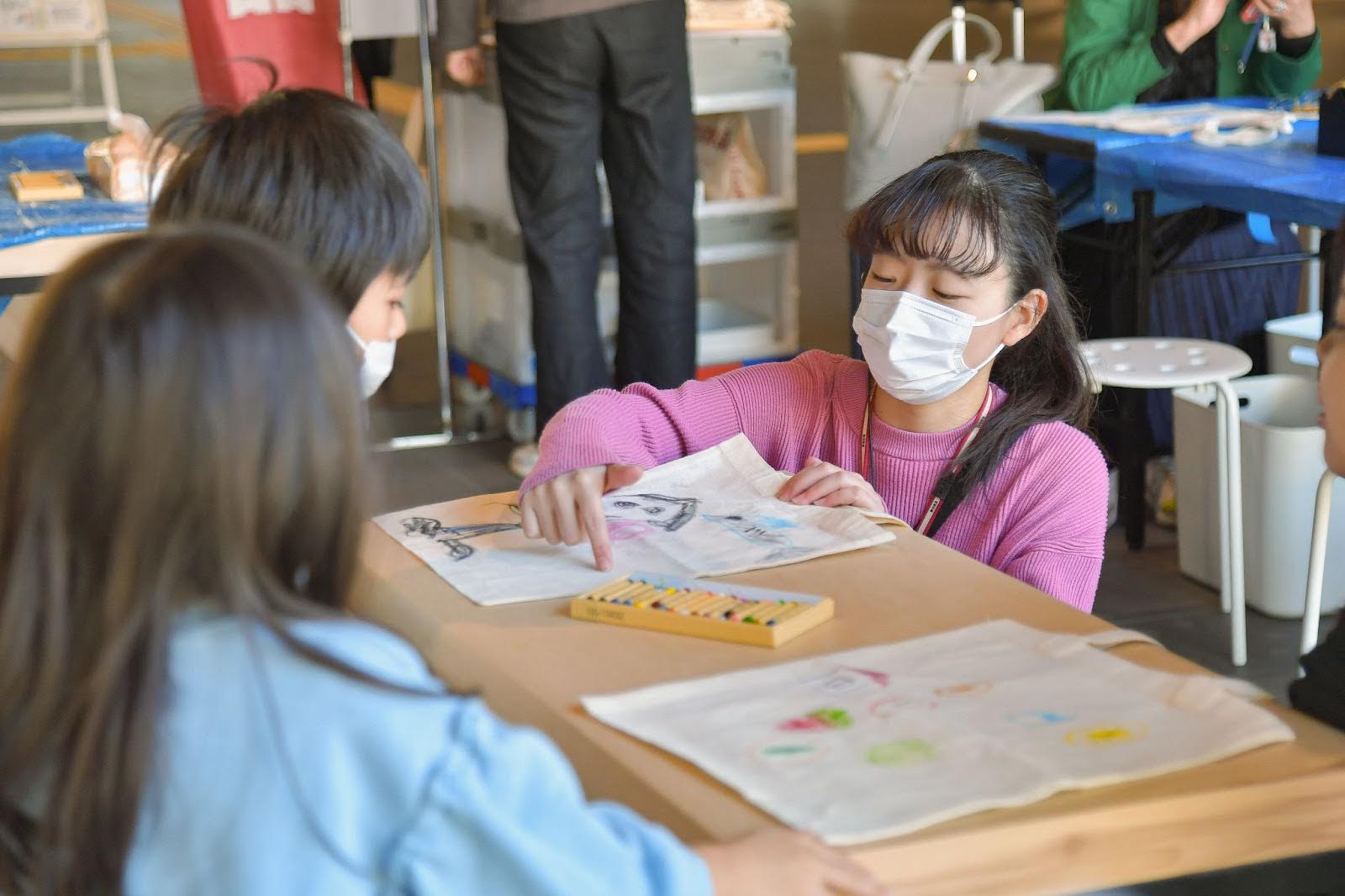 同じく星川駅前特設ブースにて、オリジナルバッグを制作するワークショップが行われました。幼児から小学生を中心に、大人の方まで幅広い年代の参加者が開始直後から次々と集まり、あっという間に満席に。無印良品の布製バッグに、布用のクレヨンを使って、好きな言葉やイラストを自由に描き、世界に一つだけのバッグづくりを楽しんでいました。