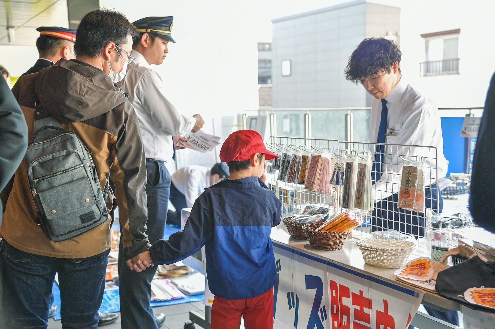 駅名パネルやつり革、時刻表など、ここでしか手に入らないアイテムを求めて、早朝から鉄道・バスファンが集結。子どもから大人まで、真剣な眼差しで商品を手に取る姿が印象的でした。