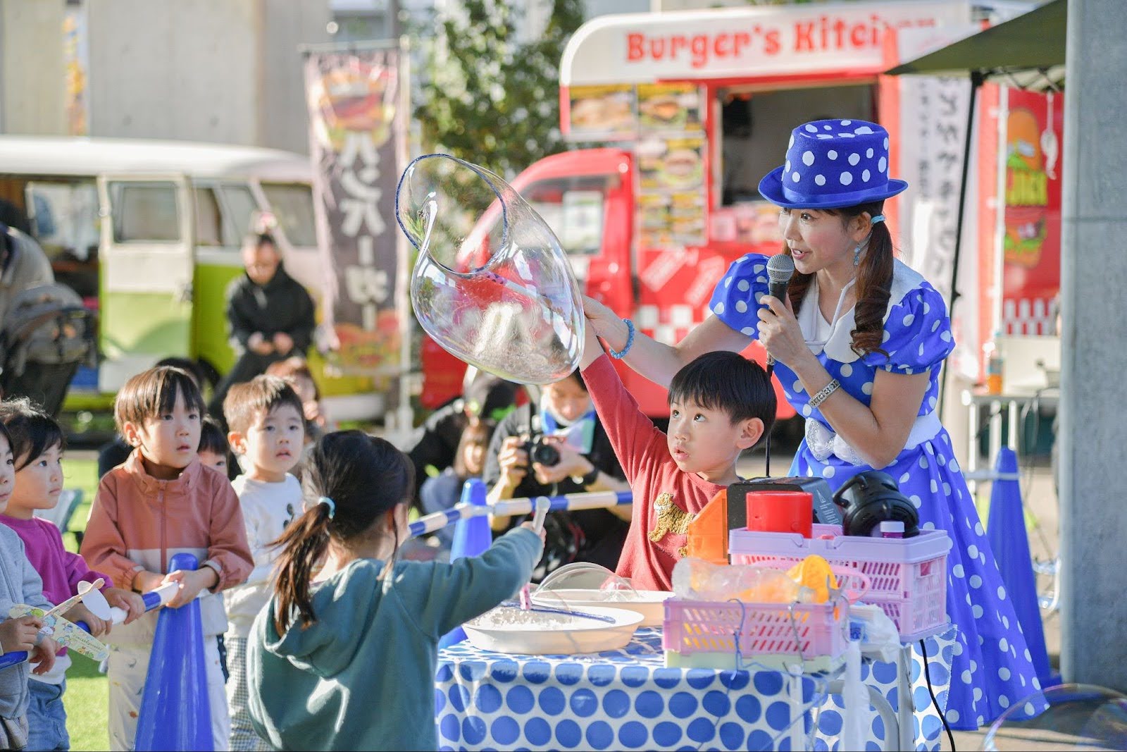 太陽の光がやわらかな西日に変わる頃、シャボン玉ショーで全国を回る バブリン先生 が登場。大きなシャボン玉、小さなシャボン玉、白く色づいたものまで、空いっぱいに広がるシャボン玉を追いかけ、子どもたちが元気いっぱいに走り回ります。