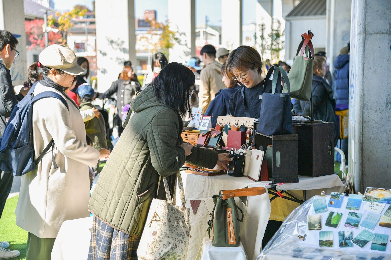 芝生広場の一角では、PILEで活動する4名のクリエイターによる 「試行錯誤展(マルシェ)」 を開催。カレンダーやポストカード、ZINE、革製品など、それぞれの試行錯誤が形になった作品が並びます。
