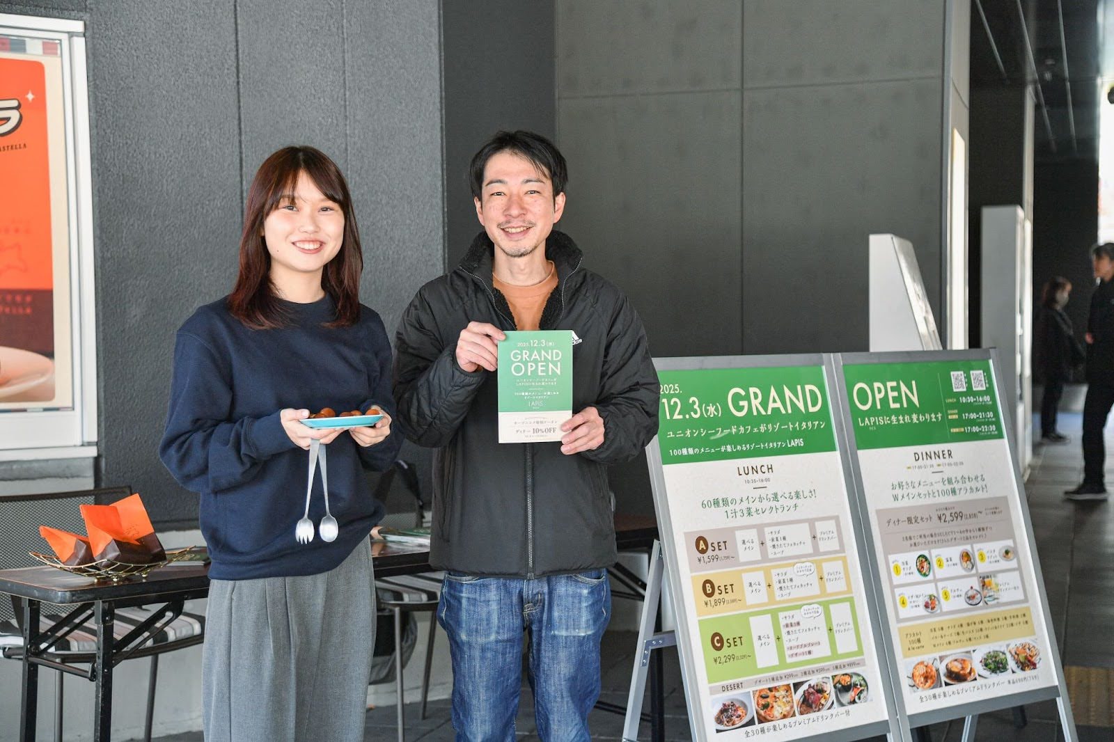 12月3日にリゾートイタリアンレストラン「LAPIS」としてリニューアルオープンを迎えた「UNION SEAFOOD CAFE」では、リニューアルの告知とクーポンの配布が行われました。足を止めた方との会話が、そのまままちの案内につながる場面も多く見られました。
