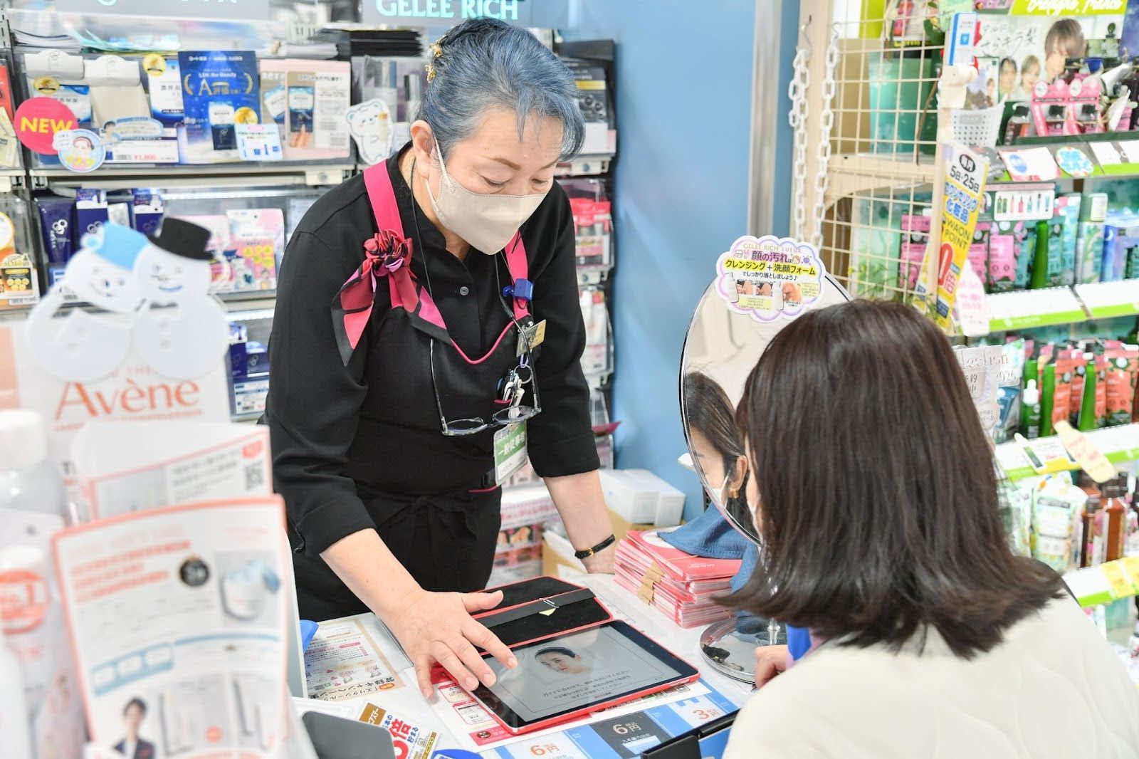 ハックドラッグでは、タブレットを使った「肌測定」体験を実施。買い物のついでに立ち寄り、気軽に相談できる場となっていました。