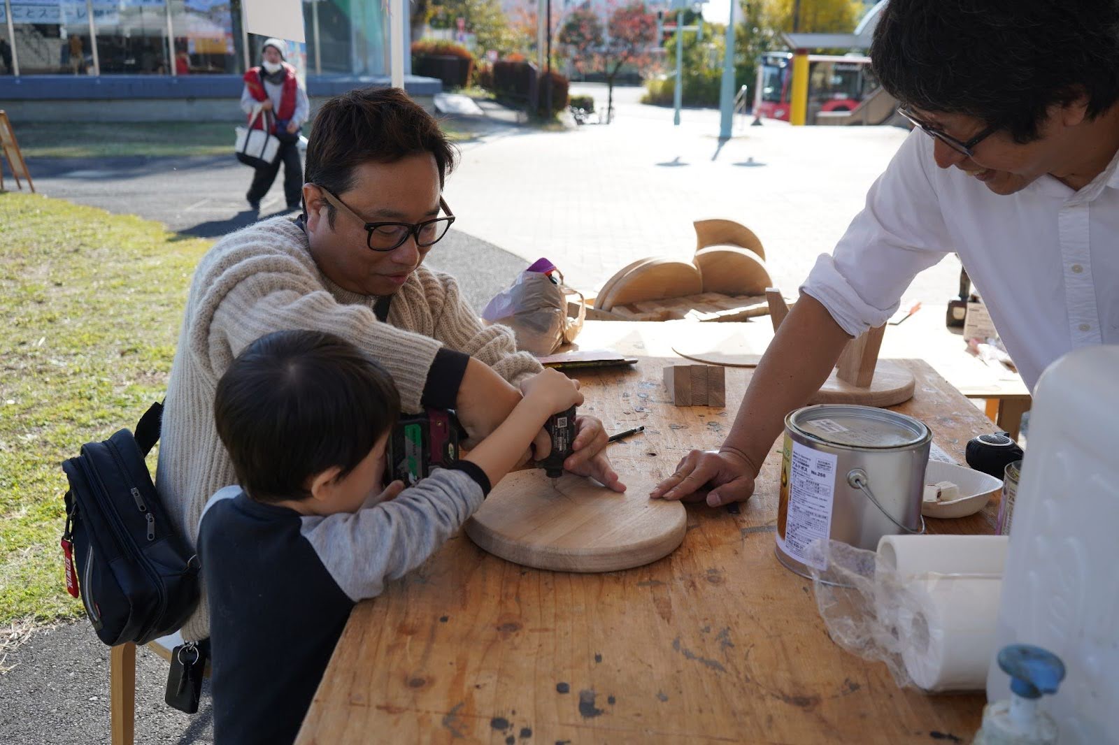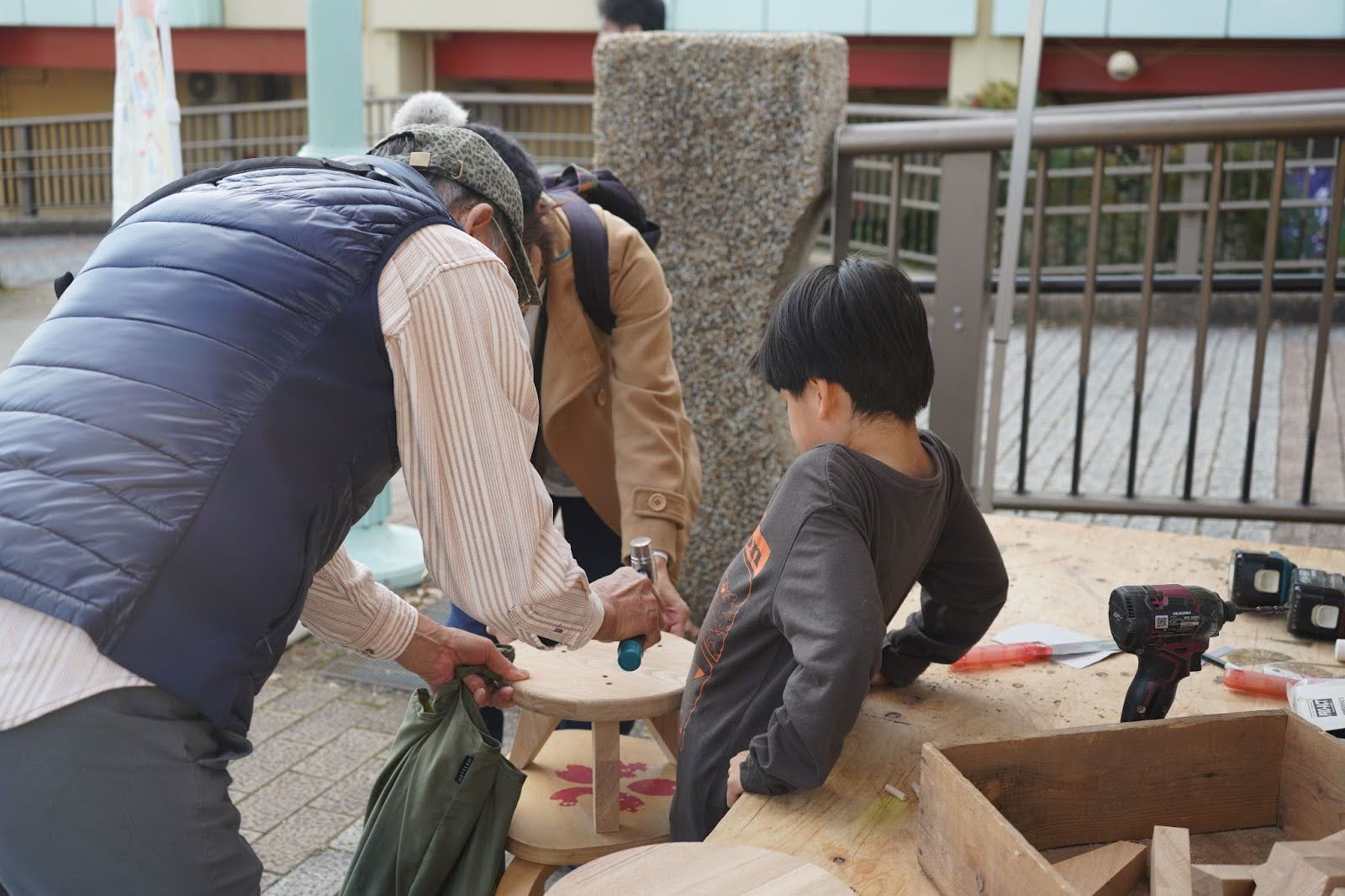 「まるはち一箱古本店」では、ミニちゃぶ台作りのワークショップを開催。子どもたちも興味津々でしたが、親御さんやシニアの方、若い女性も和気あいあいとDIYに挑戦されている姿が印象的でした。
