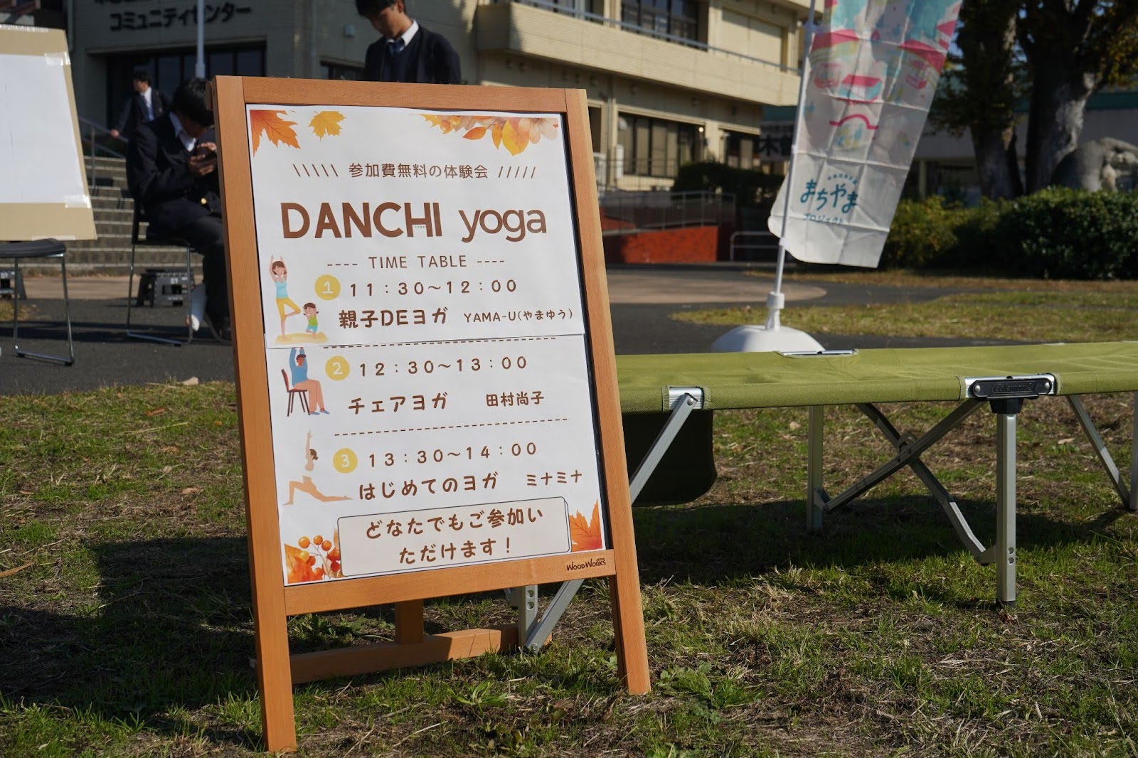最初はインストラクターのyama-U(やまゆう)さんによるヨガからスタートです。団地や近くにお住まいの方々が集まってくれました。yama-Uさんが大切にしているのは、”自分に還るヨガ”。
