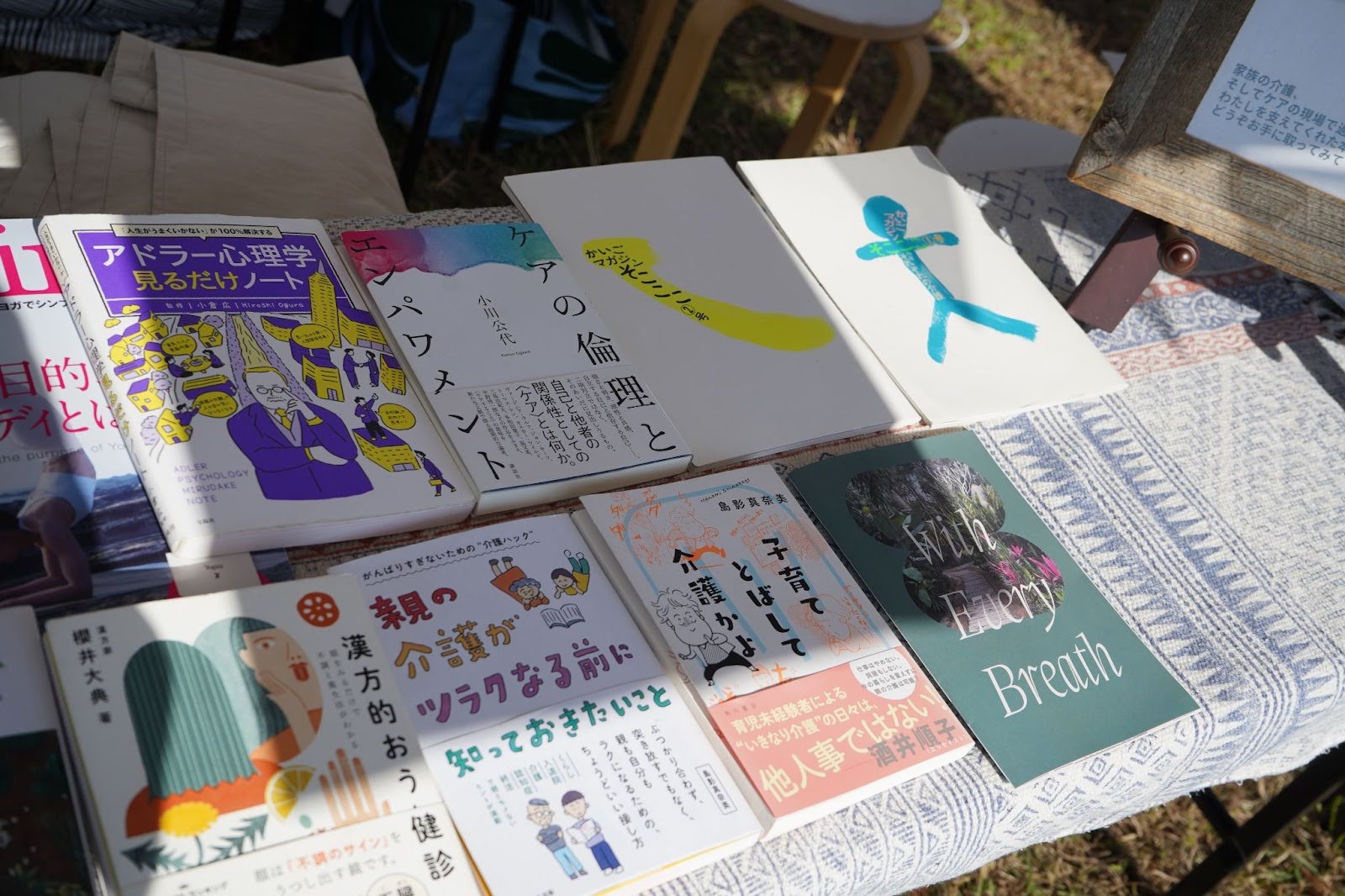 ご自身の介護経験から始めた、セルフケアの大切さを伝える活動。今回は田村さんが介護をする中で救いとなった書籍や雑誌、オリジナルzineの展示も行われました。