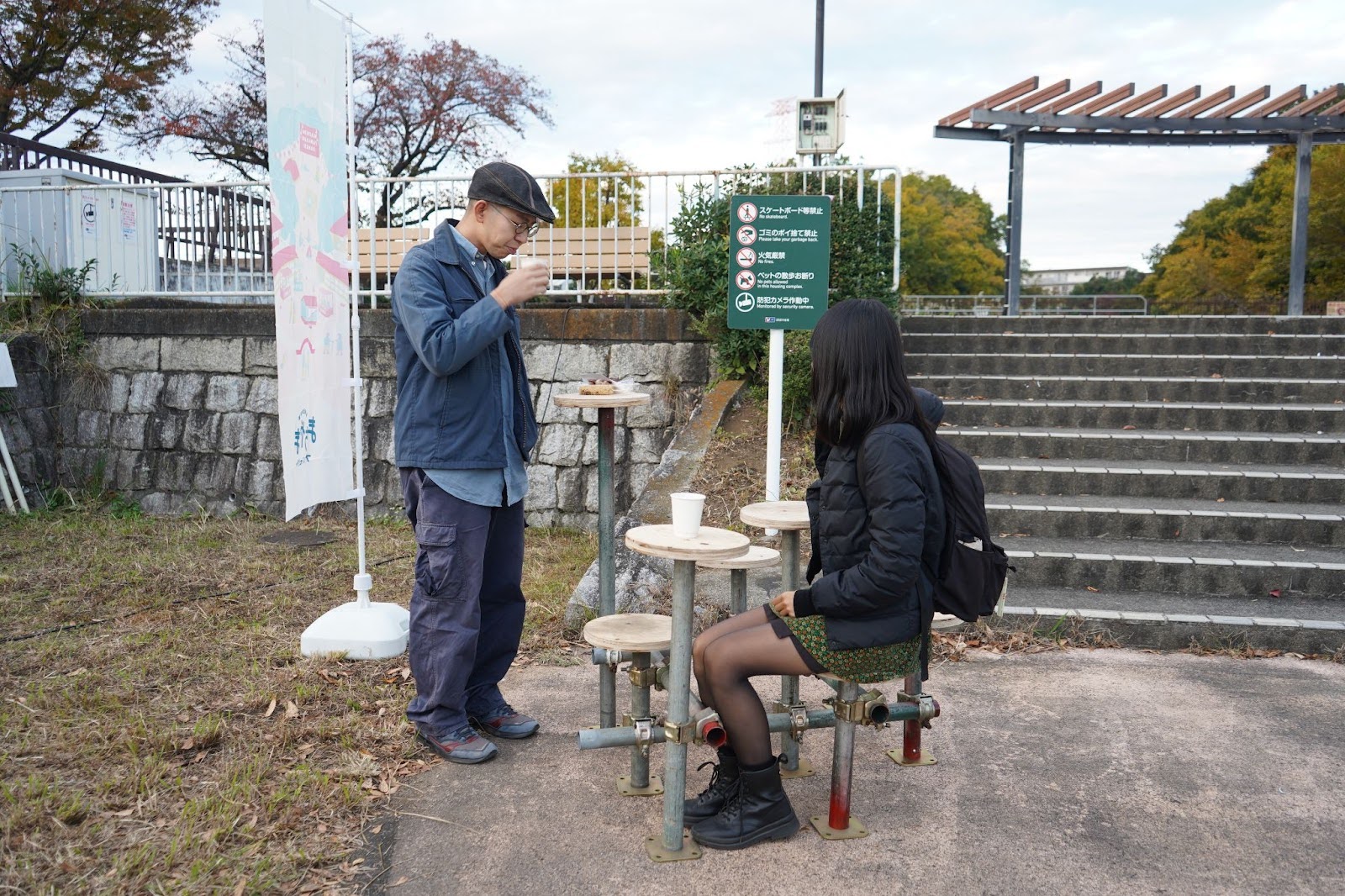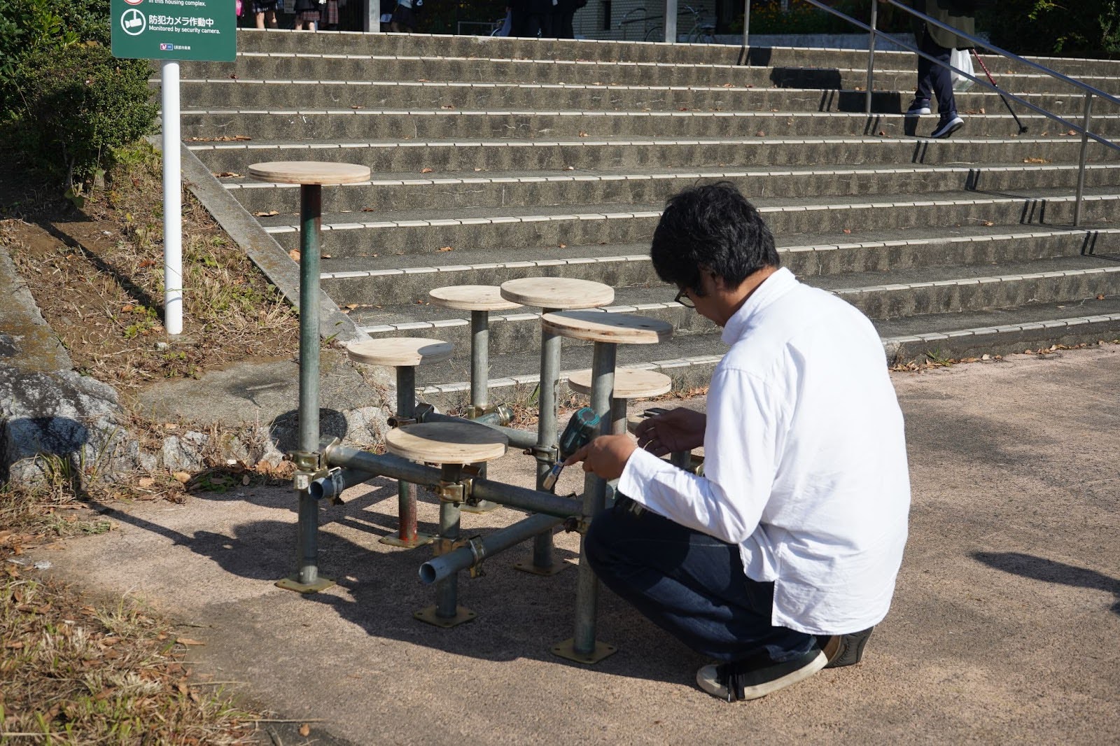 人とのコミュニケーションを楽しみながら、ものづくりをされている八塚さん。今回は広場の憩いの場として、実験的にベンチも設置してくれました。