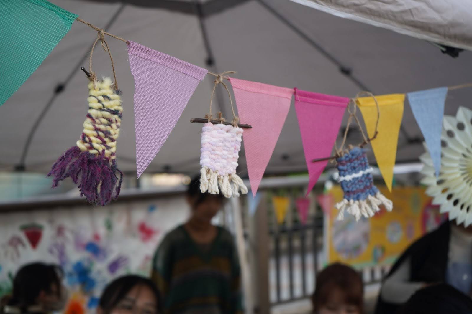 今回でまちやままるごとスコーレへの参加は3回目!季節は秋ということで、毛糸を使ったワークショップを考えてくれました。みんなで小さなタペストリーを作って、最後はガーランドにして繋げていきます。