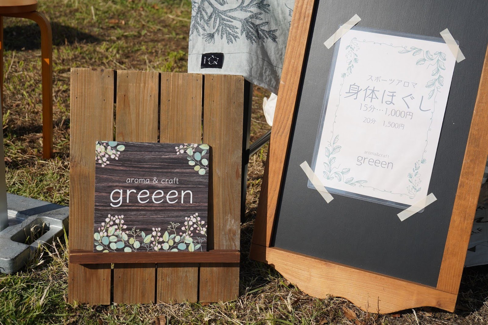 町田市鶴川にサロンを持つ「aroma&craft greeen」のテントでは、身体ほぐしとアロマ販売の出店がされました。お昼寝したくなるような広場の一角で、マッサージが受けられる至福な空間です。アスリート向けのマッサージに必要な筋肉をほぐす技術と、アロマオイルでリンパを流すマッサージ。その2つを掛け合わせた施術、”スポーツアロマ”が体験できました。
