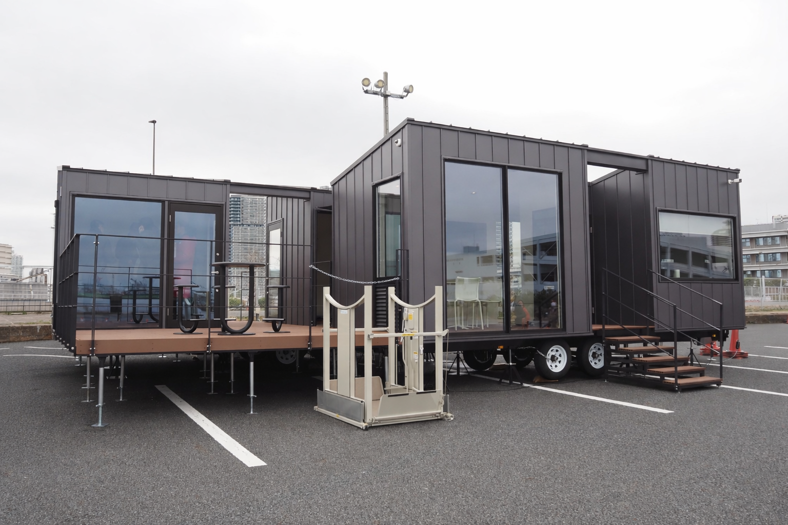 続いて見学したのは、今回の実証実験における旅客ターミナル。ここで活用されていたのが、YADOKARIの2台のトレーラーハウスです。2台の車両をデッキで繋ぐことで、複数の役割をもつ空間が構成されていました。