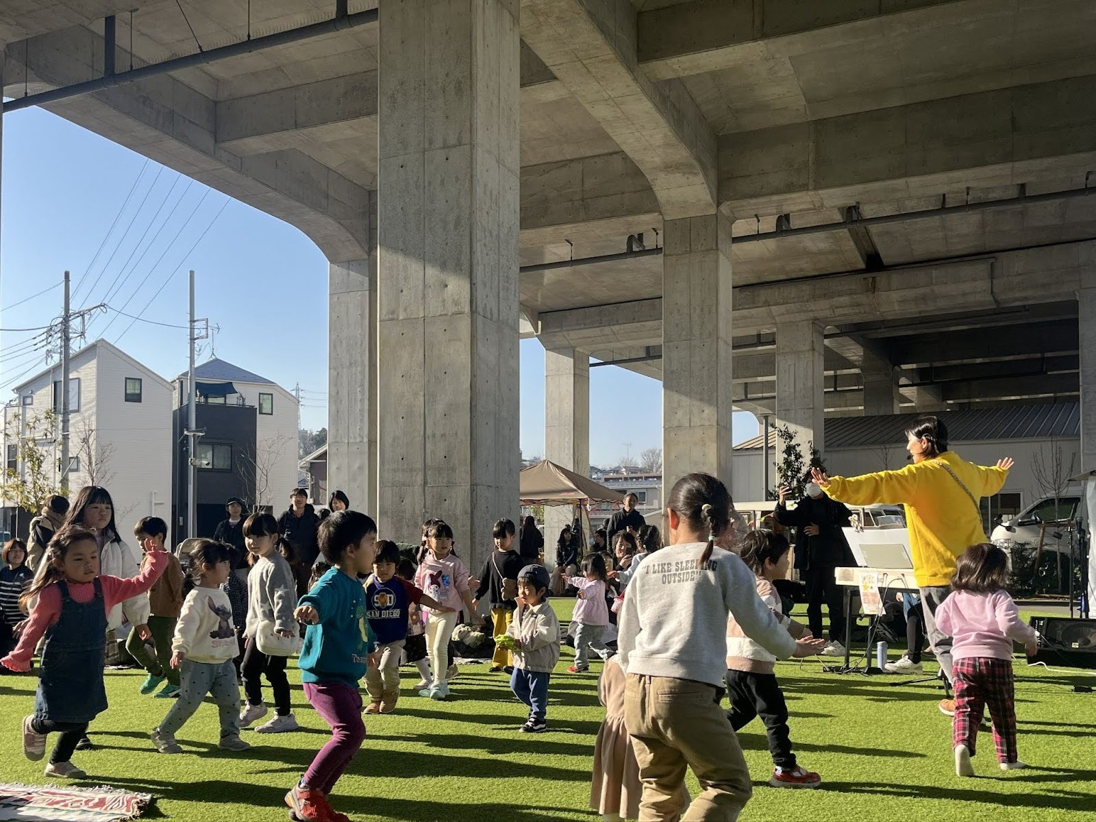 「リトミックを屋外で行うのは初めてだったので、少し不安もありましたが、子どもたちがノリノリで参加してくれて、ママさんたちもニコニコしながら、見守ってくださっていて、私たちもたくさん元気をもらいました。