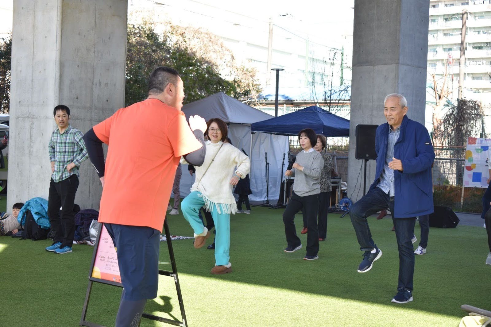 最初のステージは、特定非営利活動法人FRIENDの本間さんによるエアロビクス。イベント開始前から、芝生広場にはお子さま連れの方やシニアの方など、幅広い世代の人たちが集まります。