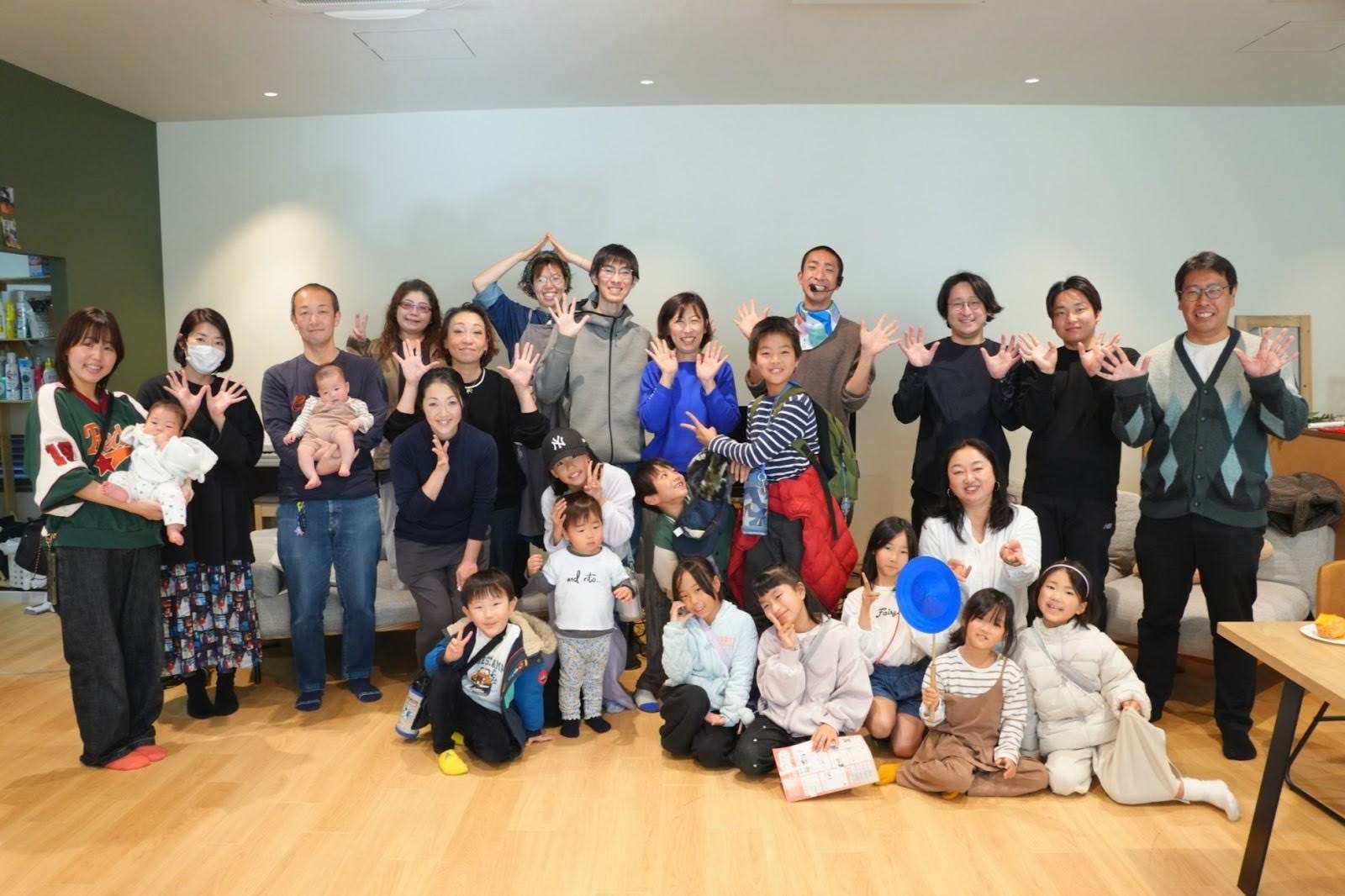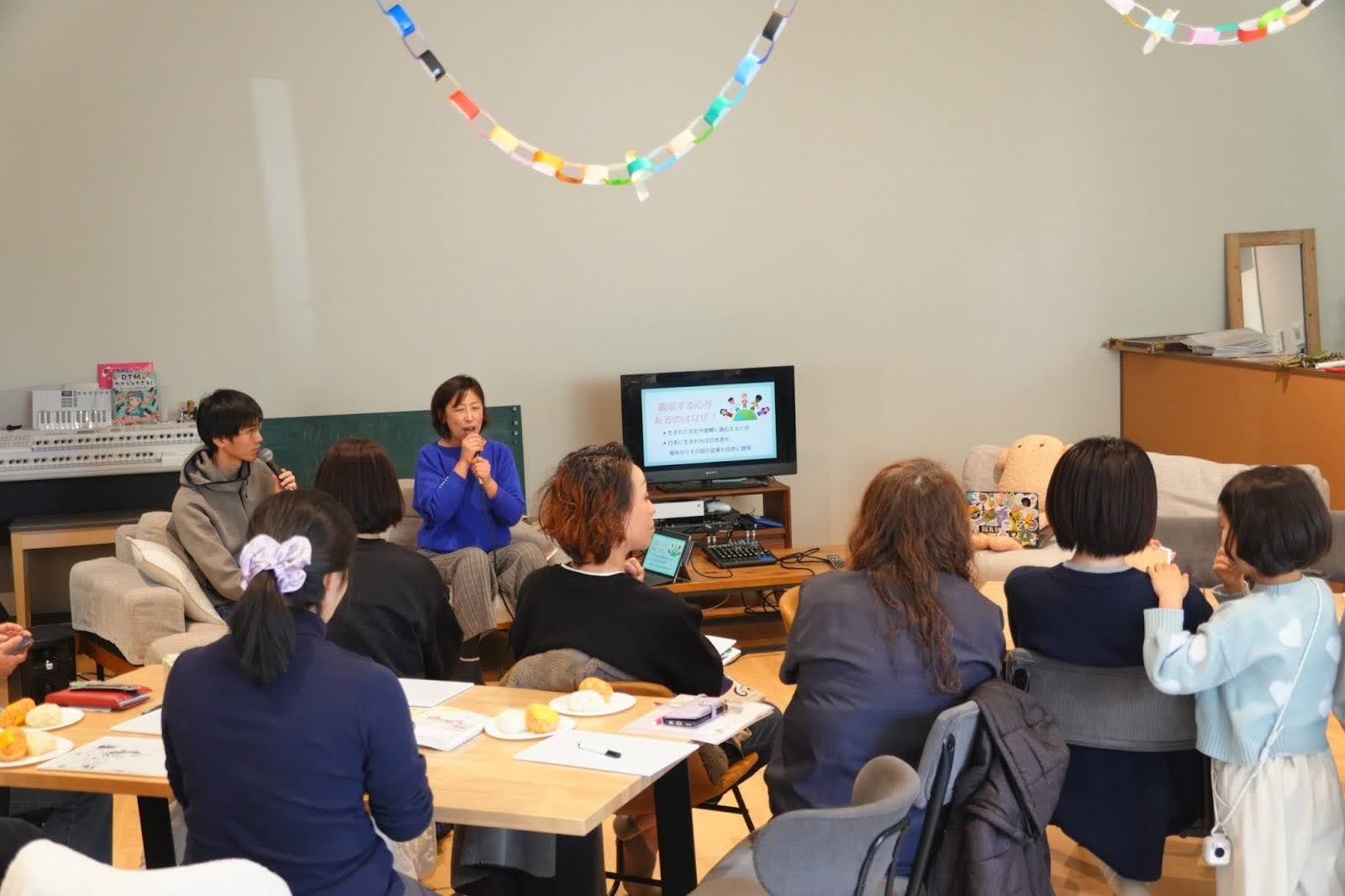 リビングには、近隣にお住まいのお母さん・お父さん、そして4か月〜小学生の子どもたちが集まり、会場は大にぎわい。