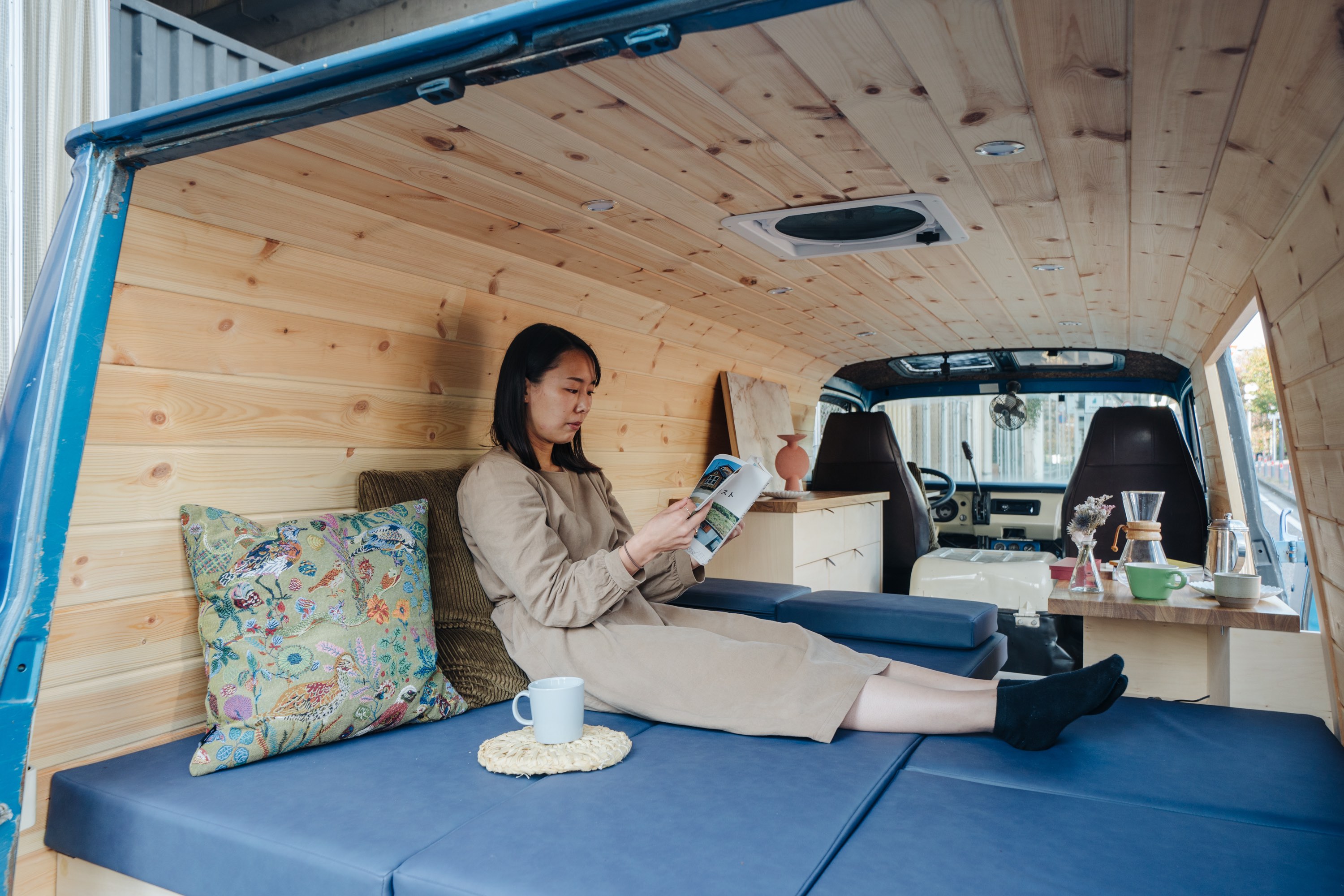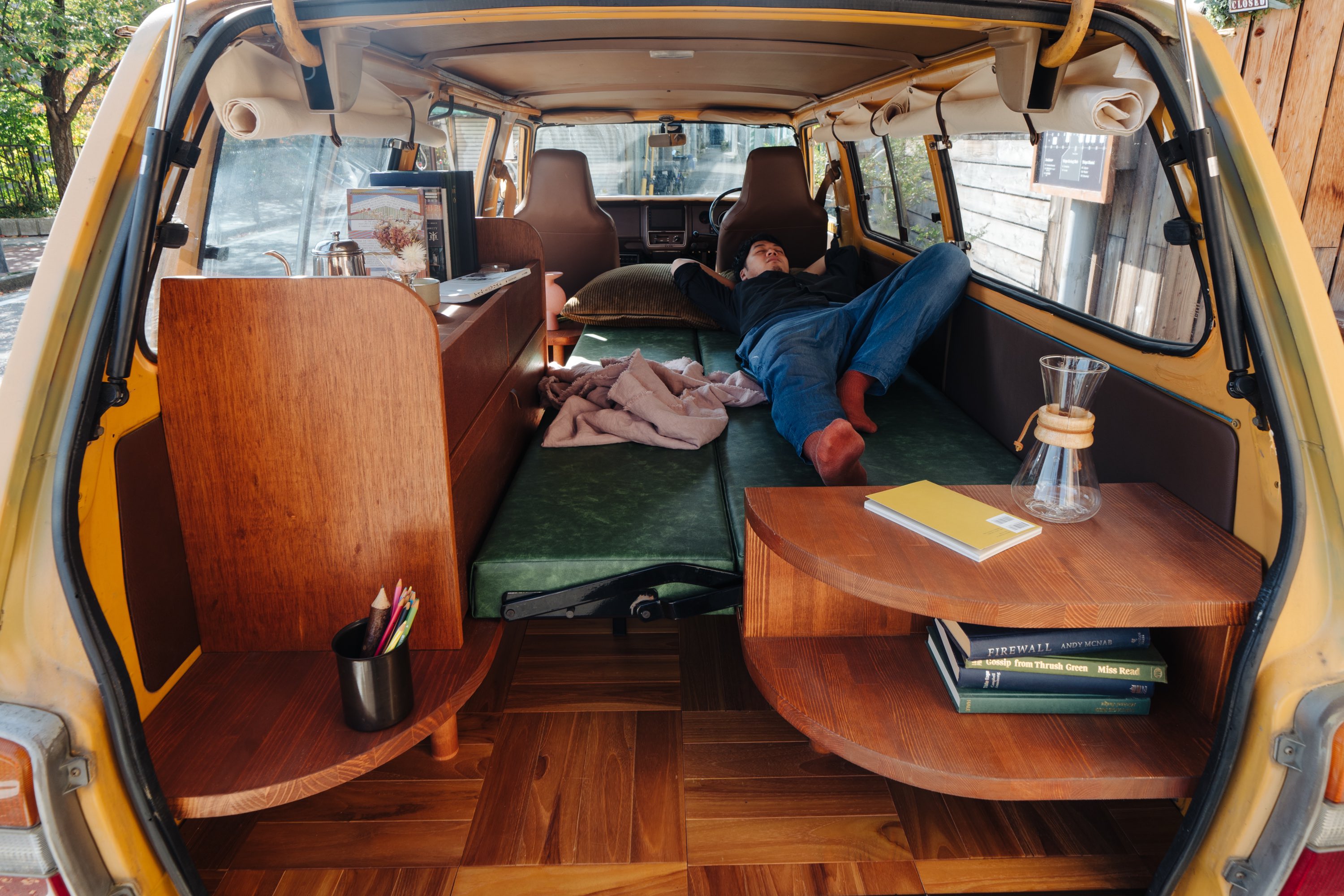 YADOKARIの遊び心を生かして、ヴィンテージバンを改装。より移動性を重視しながらも、バンの中での過ごしやすさにもこだわりました。バンライフなどの宿泊はもちろん、デザイン性を活かしてウェディングやイベントのアイキャッチとしてもご活用いただけます。(ヴィンテージバンは1週間以上からレンタルが可能です。)