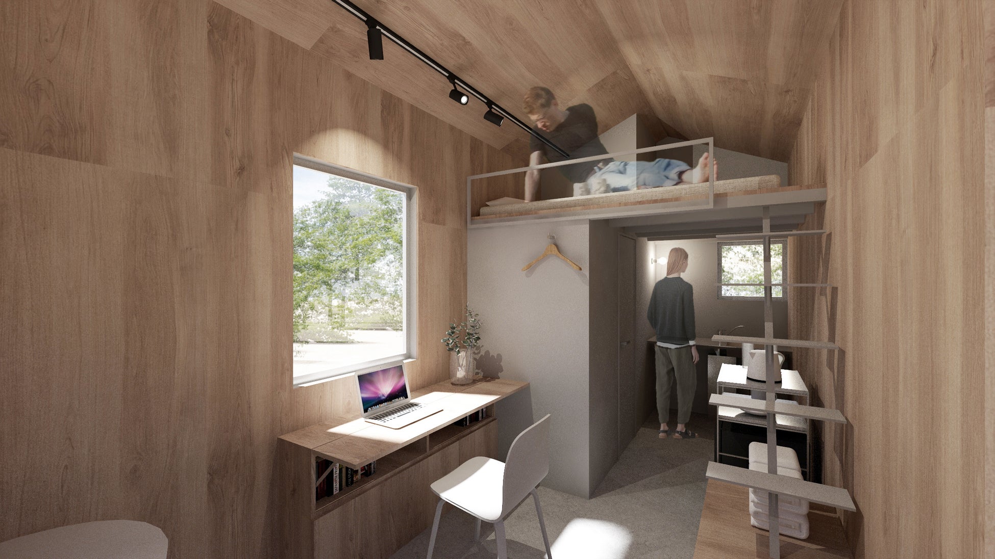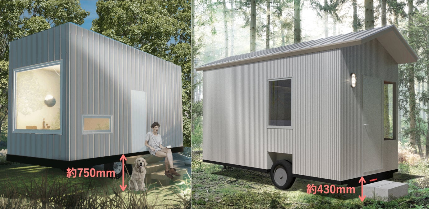 - 海でも山でも好きな場所に移動できる、シャーシ付きの移動式タイニーハウス。