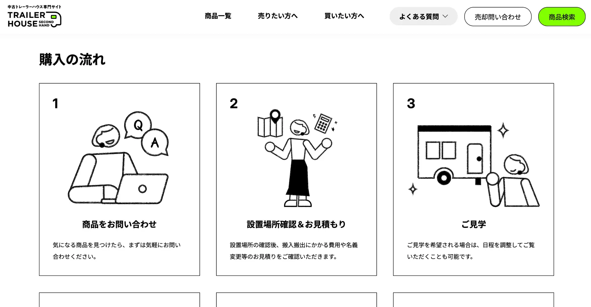 売却・購入の流れやFAQをサイト内でわかりやすく案内。