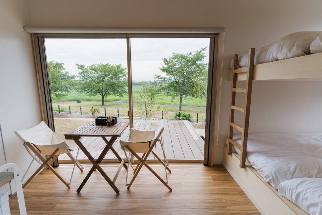 周囲の自然をご堪能いただける広いデッキへは、トレーラーハウスの室内、そして屋外の両方からアクセス可能。BBQやキャンプなど多目的にお楽しみいただける空間です。