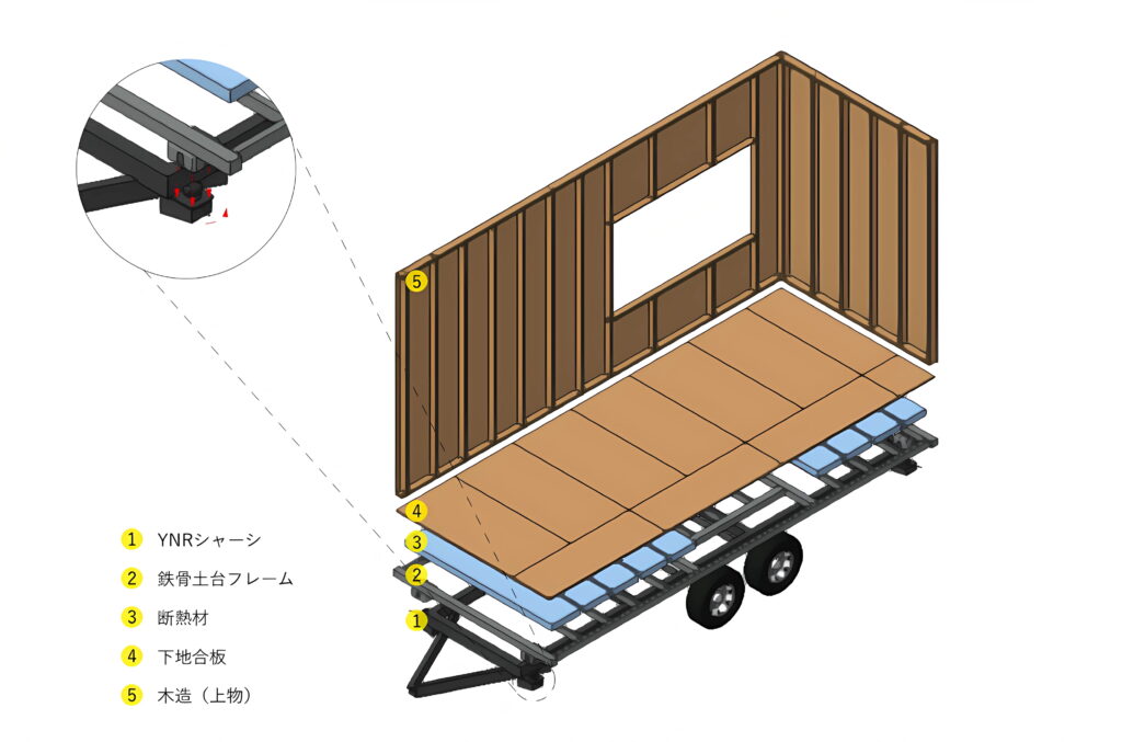 通常トレーラーハウスのシャーシ部分は鉄骨で構成されており、木造で上物を製作する場合、シャーシと上物の接続には工夫が必要となります。