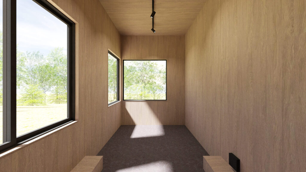 リビングエリアの天井高は約3m。大きな窓からは美しい風景が広がり、タイニーハウスでありながら開放感のある空間を演出します。