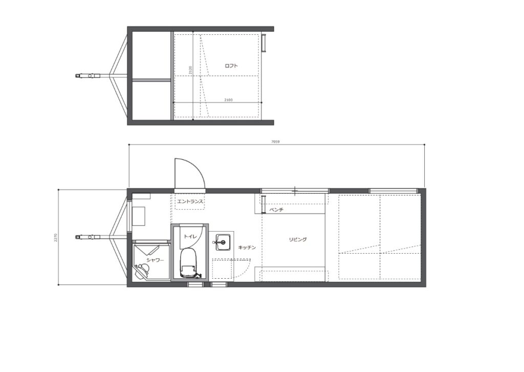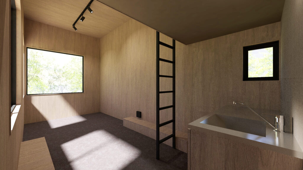 水回りの上部にはロフトを配置し、限られた面積を効率的に活用。キッチン、トイレ、ユニットシャワー、洗面台がコンパクトながら実用的にレイアウトされており、複数人でも快適にお過ごしいただけます。