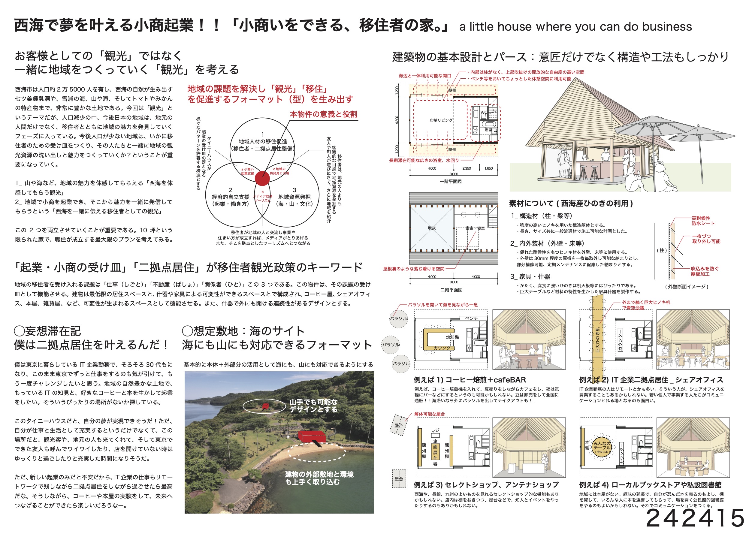 各委員の闊達な意見交換のあと、最優秀賞の選定は意見が分かれました。山荘風の優れた作品か、観光と小商いを通して二拠点試居住も視座した提案か。提案の優劣ではなく、観光を通して働き方のデザイン・コモンを考えさせる提案が、地域を元気にするきっかけになるだろう!と評価しました。