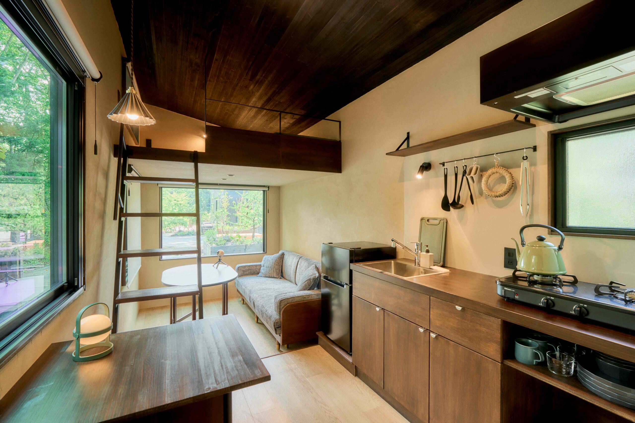 ミニキッチン、シャワー、洗面台、トイレを完備し、屋外には前庭も併設。プライベートな空間でありながら、自然とのつながりを感じながらお過ごしいただけます。