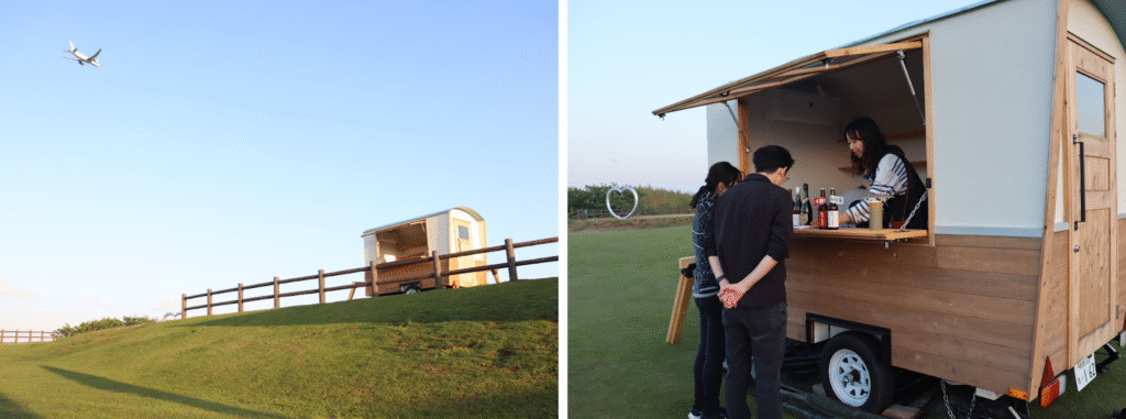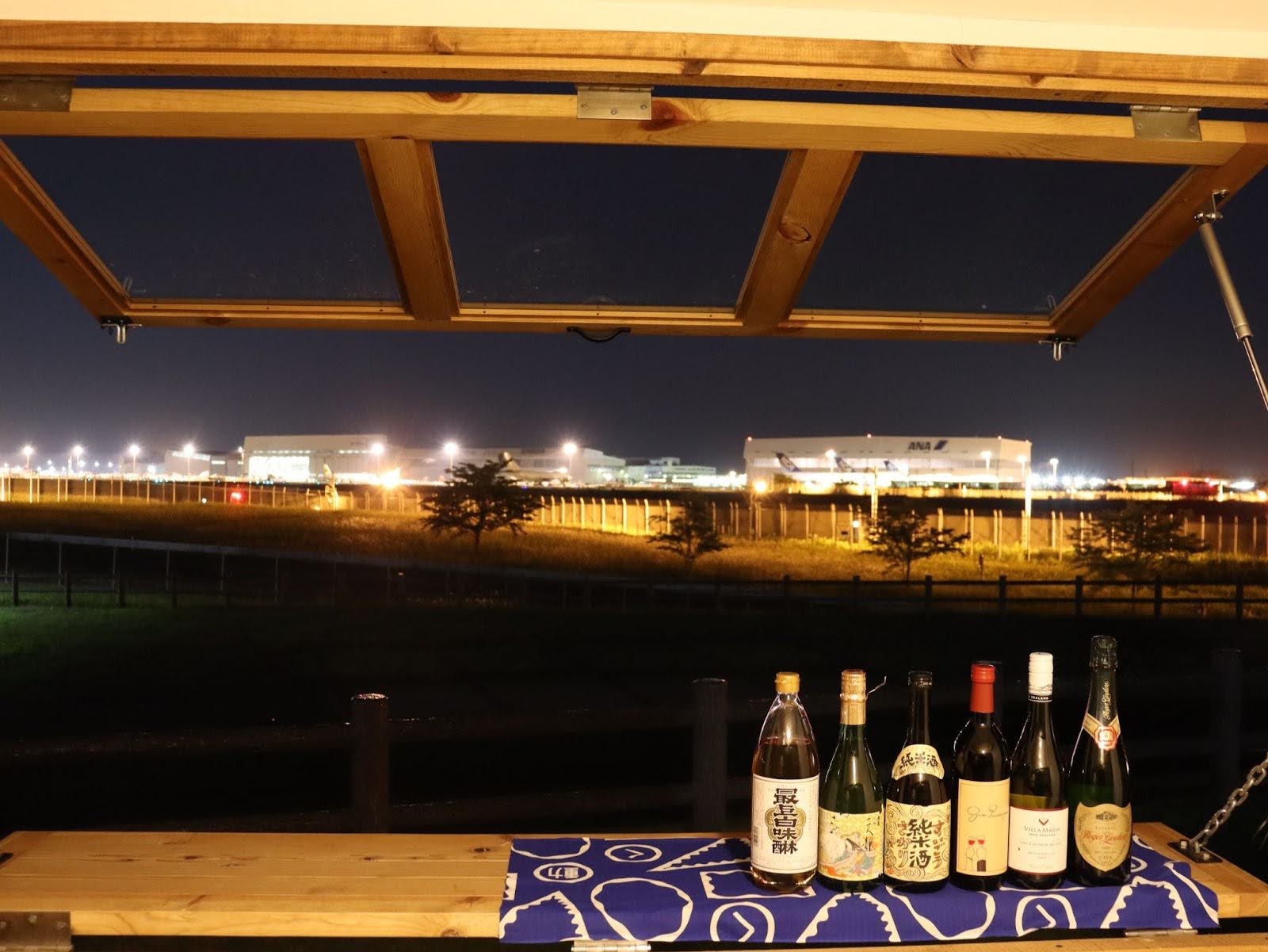 飛行機が飛び立つ瞬間を眺めながら、ゲートグルメ様よりご提供いただいた機内食のお弁当を楽しむ特別な時間をお楽しみいただき、ツアーのために特別に設えたバーカウンター仕様のROADIE miniには、髙橋酒店で購入したお酒や、成田空港が開発した地ビール「NARITA AIRPORT ALE」が並び、空港エリアならではの体験を演出しました。