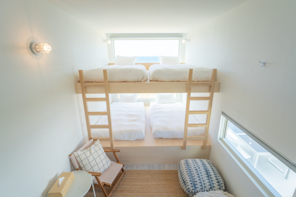 ダブルベッドと2段ベッドの2種類を設け、カップルからファミリーまで楽しめる仕様となっております。